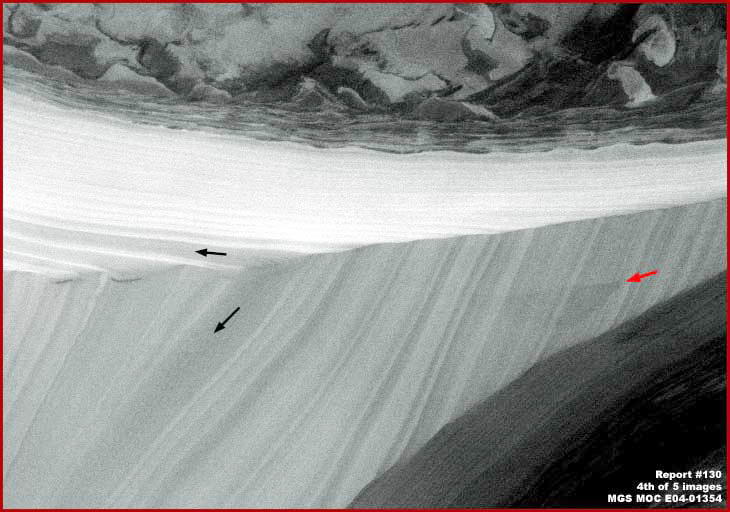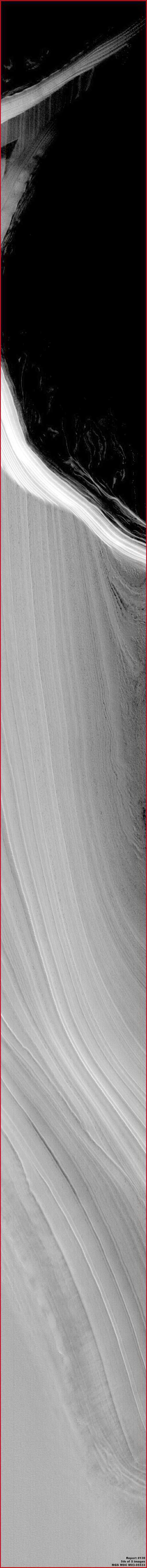 a fenti, negyedik képet elforgattuk 90 fokkal az óra járásával egyezően, az előző felvételen látható jégtömeg egy részét láthatjuk valamivel jobban. Figyeljük meg jégtömb távolabbi oldalán jelentkező, erősebb fényvisszaverődési tényezőt, a hozzánk közelebbi rész enyhén árnyékos, igazolva, hogy a képződmény csak gyenge árnyékot vet, egyúttal azt is, kiemelkedő formáról van szó. Ne felejtkezzünk meg róla, hogy jégről van szó, az pedig részben átereszti a fényt. Ez azt jelenti, hogy a közelebbi oldalt tekintve, bizonyos mennyiségű fény áthatol a jégtömegen, s ez csökkenti az árnyékhatás mértékét. Továbbá, a félszigetet formázó anyagnak igen keménynek kell lennie, hiszen egyébként nem jöhetett volna létre az igen élesen mutatkozó gerincvonal. A két fekete nyíl mindösszesen egyik sötétebb sávra mutat a sok-sok közül, melyek a jégfélsziget felszínét jellemzik, felhívják a figyelmet arra, hogy a sávok mindkét oldalon jelen vannak, s arra is, hogy ugyanott vannak jelen, az oldalfalai igen meredekek, maga a félsziget pedig magasra emelkedik ki. A piros nyíl ismételten az alakzat sötét oldalát mutatja, azon is egy ék-szerű formát, ugyanez az alakzat felbukkan a második képen is. Miként látható, jelen esetben kissé halványabb, körvonalai kevésbé élesen jelentkeznek. Ennek a jelenségnek legalább az egyik oka kétségtelenül az lehet, hogy a második, az M03-05533 jelű fotócsíkon sokkal határozottabban jelenik meg ez az alakzat, az a kép 1999.05.18-án készült, míg a jóval halványabb E04-01354 jelű felvétel majdnem 22 hónappal később, 2001.05.18-án, már ami a hivatalos statisztikákat illeti. Miként kerülhet egy ilyen ék-forma alakzat, ilyen határozott és éles körvonalakkal a hozzánk közelebbi oldalra, erre az igen meredek lejtőre, a nyilvánvalóan igen kemény és homogénnek tűnő anyagra, ráadásul egyik oldala éppen párhuzamos a hegygerinccel – ki tudja. Ha valamiféle kitörés lett volna, akkor a meredek lejtő kétségtelenül másféleképpen megmutatkozó hatást váltott volna ki rá, legalábbis az ék-forma irányítottságában és éles körvonalában. Másrészről, ha olyasminek lenne a nyoma, ami vízszintes irányban sebesen repült a felszín felett, s becsapódott a jégfalba, visszahagyva maga után ezt a roncsmezőt, a további darabok pedig aláhullhattak a meredek lejtőn, ez magyarázatot adhat az ék-forma egyik oldalának párhuzamosságát illetően a hegygerinccel, de akkor miért nincs semmi egyéb észrevehető nyom a lejtőn? A becsapódó objektum ennyire lágy volt, netán a lejtő anyaga ennyire kemény? Valami nagyméretű, repülő gombáról lenne szó, tele sprórákkal, az irányítás csődöt mondott a különös légköri hatások miatt? Ezek a fotócsíkon fentebb láthatók. Placcs! Netán kemény meteoritról van szó, még nálánál is keményebb valamibe ütközve ahhoz, hogy szétfröccsenjen? Lehetséges lenne, hogy egyáltalán nem jégről van itt szó, hanem valami másról, de sarki anyagnak álcázva? Számos kérdés, ám jóval kevesebb válasz. Azonban itt az újabb rejtély, maga a világos színű anyag, a maga sávos szerkezetével A Sarki Sapka jegében megfigyelhető sávszerkezet egyáltalán nem számít szokatlannak a Földön sem. Lehullik a hó, vízszintes rétegekben gyűlik össze a Jégsapka felszínén, mintegy takarókat hozva létre, egyiket a másik tetején. Légköri por és szemcsék hullanak aztán rájuk, összegyűlnek a Sarki Jégsapka egyes rétegein, megszínezve kissé külön-külön azokat. Vágjuk át aztán meredek szögben ezt az egészet, s a vízszintes rétegek máris mint sávok jelentkeznek a függőleges irányú metszetben, különböző vastagságban megjelenve. Nagyon hasonlatos dolognak lehetünk itt szemtanúi, ám miként jöhettek létre ezek a közel függőleges irányítottságúnak mutatkozó sávok? Olybá fest, mintha valaki kiemelt volna egy igen mély függőleges vágatmintát, felemelte volna, és vízszintesen végigfektette volna a felszínen. A gyűrődésekről szólva, vessünk egy pillantást újból a fenti, ötödik felvételre, az M03-05533 fotócsík részletére, mely ugyanabból a fotóból származik, mint az első és a második kép. Az említett fotócsík közvetlenül az E04-01354 jelű fotócsík jobb oldaláról származik. Ennek a fotócsíknak a felső része pontosan ugyanazt a területet ábrázolja, mint a második felvétel, itt azonban elég nagy darabot láthatunk a Sarkvidék felszínéből, a félsziget alatt. Ha lefelé görgetjük a képet, számos párhuzamos vonal tűnik fel, közvetlenül a sötét mélyedés szomszédságában, ha pedig tovább haladunk lefelé a felvételen, eljutunk magához a sarki sapkához is, mely itt síknak mutatkozik és sávmentesnek. Nehéz meghatározni ilyesféle dolgokat ezeken a keskeny látószögű, kétdimenziós felvétel-szeleteken, azonban elmondjuk, Skipper gyanúja szerint mi is megy itt végbe. Nézete alapján, a nagyon világos színű, nagyjából sík terület a harmadik és az ötödik felvétel alján a normális hó-/jégsapka része, mely vízszintes rétegekből halmozódott fel épen úgy, ahogy az a Földön is végbe megy a sarkvidékeken, ráadásul a környékbeli alakzatok közül ez nyúlik a legmagasabbra. Azért ennyire kiugró e formáció, mert a szegényes fekete-fehér fotóból elég látványosan virít, mellette, éppen nagyon erős fényvisszaverő-képessége miatt meglehetősen sok részlet is elveszik általa.