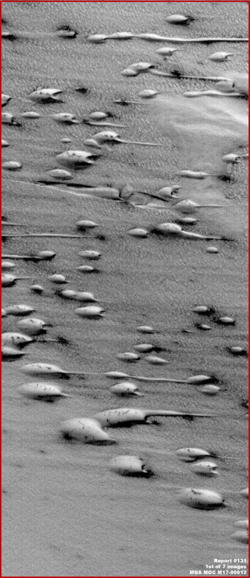 A fenti, első felvétel az igen hosszú, a hivatalos jelzés szerinti MGS MOC M17-00612 jelű keskeny látószögű, egyenes állású GIF felvétel felső részéről való. A kép szélességében teljes mértékben átfogja a hivatalosan kiadott változatot, annak egyik szélétől a másikig, a statisztikai adatok szerint 1,66 km-es szélességben, bár valószínűleg nem mindenkit érdekel a statisztika. Habár első ránézésre nem tűnik fel, e fotócsík felbontása erősen lerontott. A normális méretű objektumok igen homályosak és zavarosak, egyúttal meghamisítottak is. Ezek a beavatkozások jelentős hatást fejtenek ki a helyszínt beborító növényzet megjelenésére, nyilván azért, hogy ne lehessen azt felismerni. Jelen beszámolónak azonban nem ez a témája. Hogy a felszín mégis jól néz ki, annak köszönhető, hogy a rajta megjelenő formák világos színűek, elég méretesek, s a felbontási korlátok ellenére aránylag jól láthatóak. Érdemes ezeket a szempontokat szem előtt tartani a fotócsík többi elemének vizsgálatakor is. Az igazat megvallva, a fenti helyszín nem számít „különlegesnek”, már ami a témaválasztást illeti. Azért mutatjuk meg ezeket a formákat, mert ott vannak ezen a fotócsíkon, s jó, ha minél többen tudnak róla, ezért fontos elemzésük. A bemutatott terület a Boreale Chasma vidékén található, mely lényegében a legnagyobb kiterjedésű sötét kanyon, mélyen belenyúlva az Északi Pólus jégsapkájának testébe, teljesen eltorzítva annak alakját, miként az a beszámoló legutolsó felvételén megtekinthető. A hivatalos értelmezés a számos színes formát illetően kétségtelenül (mint megszoktuk) a homokdűne változat. Nos, nem azok, de hogy mik is valójában, az rejtély. A Chasma területén általában nagy számban bukkannak fel, mint egymástól elszigetelt objektumok, nem állnak kapcsolatban egyetlen laza, szemcsés anyagból felépülő homok-rendszerrel sem. E felvételből ez nehezen derül ki, de hiszen éppen ezért rontották le a felbontást, a háttértől való elkülönülés így elmosódott lett, a növényzet jelenléte pedig kellően homályos ahhoz, hogy felismerhetetlen legyen, ráadásul, kissé olybá tűnjön, mintha homok lenne mindenfelé, s ez építeni fel ugye a homokdűnéket. Ezek az objektumok minden esetben áramvonalas megjelenésűek, ugyanabba az irányba mutatnak, és sokkal nagyobbak is lehetnek a fentebbieknél, azok ugyanis a kisebbek közül valók. Érdemes megtekinteni az „Amikor a dűnék valami másnak bizonyulnak” – című írást, s annak is különösen az 1., a 2. és a 6. felvételét. Ezek az objektumok erős belső ellenállással rendelkeznek látszólag és igen ellenállóak a külső hatásokkal szemben. Mindez abból derül ki, hogy a Kazma térségében sok jelét látjuk, nagy területeken a határozott és sekély, ám sebes áramlású folyások jelenlétének, melyek az útjuk során beleütköznek ezekbe a masszív alakzatokba, s miközben a felszín más részein eróziót keltenek, körülöttük és mögöttük, ám érintetlenül hagyják a „dűnéket”, azaz ezek az erős hatások sem tudnak kimutatható nyomot hagyni rajtuk, akkor igen nehéz elképzelni, hogy a szél hordta volna őket össze egy-egy kupacba önmagában. Ezek a formák olykor hosszú sorokat alkotva csoportosulnak, ám alakjuk mindig ugyanabba az irányba mutat. Néha kapcsolódhatnak egymáshoz, és ilyenkor elveszítik összetartó erejüket (meghalnak?) ám ez igen ritka.