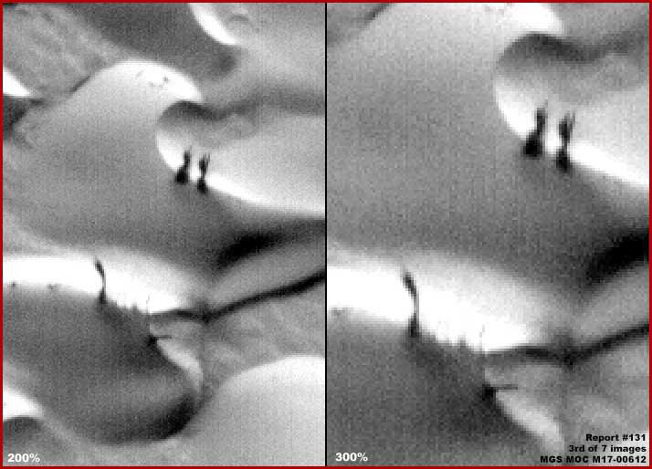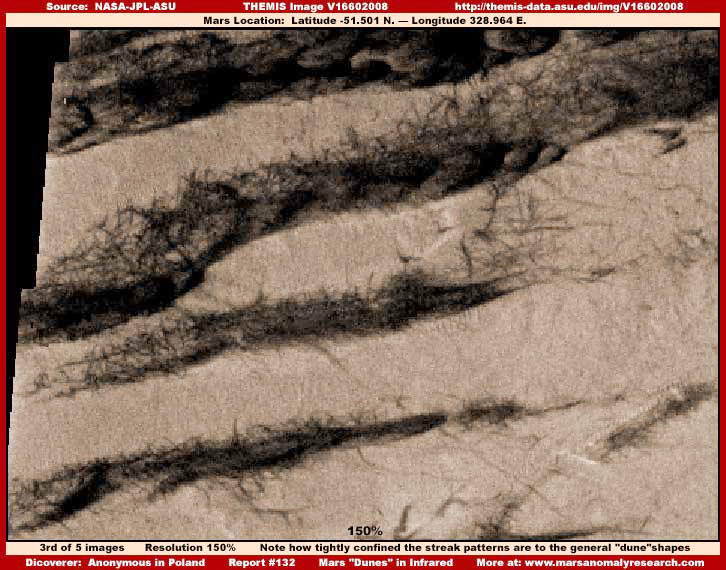 Jól megfigyelhető, hogy a „dűne” kinézetű objektumok itt nagyobbak, s miközben méretük növekszik, hajlamosak felvenni ezt a széles, hangsúlyosabb formát, egyben áramvonalasak is, sokkal ritkábban fordul elő közöttük a folyamatos, vonalszerű alakzat. Azonban nem ezek a nagy és fényes formák azok, melyekre szeretnénk felhívni a figyelmet, sokkal inkább a sötét alakzatokra rajtuk, minden esetben a legmagasabb pontjukról kiindulva. Felismerhetjük, hogy a kisebb sötét alakzatok tisztán függőleges irányítottságúak, különös figyelmet szenteljünk annak, hogy általában a nagy formákhoz képest mindegyik pontosan ugyanazon a helyen található. Normális esetben arra szoktunk ilyenkor gondolni, hogy valamiféle sötét színű növekménnyel van itt dolgunk, azonban az ismétlődően azonos helyzetük elgondolkozásra kell késztetnie mindenkit. Fel kell tennünk a kérdést, vajon az alanti tömegből valami kiálló vagy kimeredő dolgot látunk? Vessünk közelebbi pillantást az ígéretesebbnek tűnő helyszínekre.