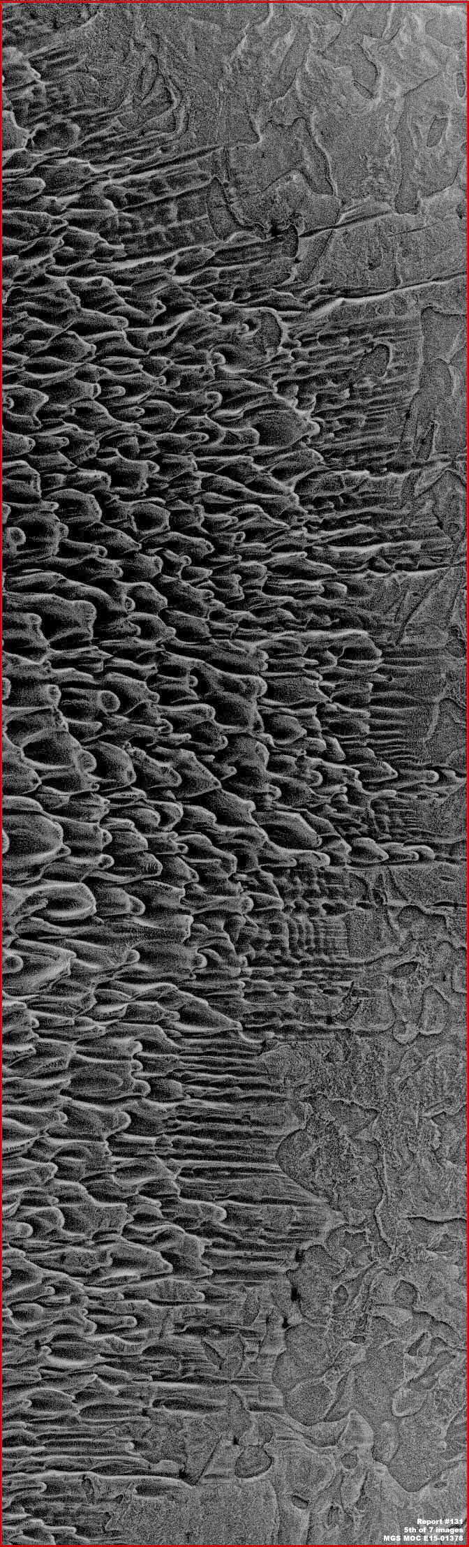 A fenti, hatodik felvétel, ugyancsak az MGS MOC E15-01378 jelű fotócsíkból való, ugyanezeknek a formáknak egy másik részét, mint az ötödik felvétel, a felbontás is megegyező, azonban 90 fokos elforgatással, az óramutató járása szerint. Miként azt itt már jól láthatjuk, s egyúttal meg is érthetjük, vajon milyen okból bukkant a számítógépes program oly sok egyedi objektumra. Függőlegesen meredő példányaik tengere tárul a szemünk elé. Amennyiben ez a helyes irányítottsága a felvételnek, miként a számítógépes program is kínálja, s egyúttal ami valóságosabbnak is tűnik, akkor ugye sok-sok függőlegesen felmeredő formát látunk, innentől kezdve pedig már semmiféle hasonlóságot nem mutatnak a dűnékkel. Ismét jusson eszünkbe, hogy habár ez a terület mélyen az Északi Sarkvidék jégsapkájának szélén belül található, a felszín mégsem havas/jeges, sokkal inkább sziklás. Ugyancsak tartsuk szem előtt, hogy az elforgatott kép felső része sziklás teraszokra bomlik, majd beleütközik a hó-/jégsapka anyagába, jó messzire ettől a ponttól. Végül, érdemes a szemünket nagyon közel helyezni a képernyőhöz, akkor kivehető lesz, a felszínt összetéveszthetetlen mohás, szőrös takaró fedi, ez pedig igencsak életre emlékeztet. Úgy gondoljuk, a helyes tájolást figyelhetjük ezúttal meg a fenti, hatodik felvételen, egyúttal pedig valami igen különös, ismeretlen életformát láthatunk, mely jól alkalmazkodik a sarki körülményekhez. Nem lehetünk egyértelműen biztosak benne, mit is rejtenek a formák, viszont oly mértékben jellegzetesek, ami mellett nem mehetünk el. Továbbá, ha valaki megvizsgálja a teljes fotócsíkot, és megfigyeli, hogy a közeli hó-/jégsapka milyen erős fényvisszaverő tulajdonsággal rendelkezik, a napfényben fürödve, akkor beláthatja az összehasonlítást követően, e helyszín viszont mennyire sötét, milyen jelentős mértékben elnyeli a napfényt, ez pedig újabb bizonyíték az élet jelenléte mellett, hiszen a napfény csapdába ejtése létfontosságú fennmaradása érdekében.