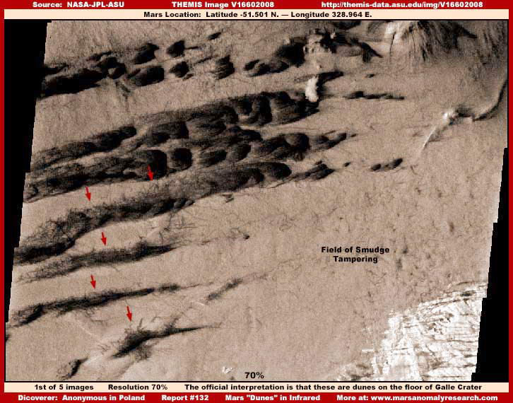 A fenti, első felvétel, méretében 30%-kal csökkentett, némileg hozzásegítve az átfogó kép kialakíthatóságához. A fotócsík egyik szélétől a másikig mutatja a helyszínt. Szeretnénk rámutatni, a fotón látható legsötétebb alakzatok a „dűnék”, mármint a hivatalos források szerint, ha valaki veszi a fáradtságot, megnézheti a felvételt eredetiben is, itt: http://themis.asu.edu/zoom-20051212a, s megvizsgálhatja a teljes fotócsíkot. Villámgyorsan és egyértelműen felismerheti, a fotón az ég adta világon semmi sincs, ami „dűnékre” emlékeztetne. Miközben ott járunk, szenteljünk egy pillantást a hivatalos meghatározásra. „Ezek a dűnék a Galle-kráter alján találhatók”. Továbbá, nem árt azzal is tisztában lenni, hogy a fenti első képen a jobb alsó sarokban látható fényes, tükröző terület a normál geológiai felszín napfényt erősen visszaverő foltja. Ez a jellemvonás teljesen természetesnek mondható a csupasz geológiai felszín esetében erős napfény jelenléte mellett. Másrészről, a jellegtelen szín és a visszaverődés teljes hiánya, véleményünk szerint, bizonytalan szélű képhamisítási beavatkozást rejt, ez a mesterséges beavatkozás a tudományos adatokba, tipikusnak vehető. Ezek a tevékenységek nemcsak azért mindennaposak, hogy elrejtsék előlünk a szokatlan információkat, hanem azért is, hogy teljességgel szétzúzzák a kontext ismereteket, melyek esetleg összefüggésben lehetnek a rendellenes jelenségekkel, s általuk esetleg különböző következtetéseket lehetne levonni, például meghatározni a valós méreteket, meg hasonlók.