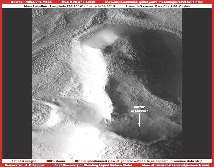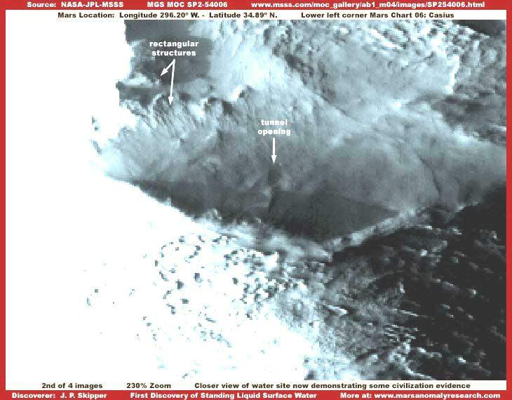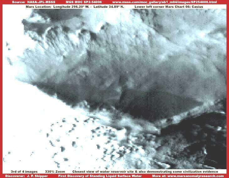 A fentebb látható második kép kicsit közelebbi bepillantást enged a vízgyűjtőre, az most már kissé kiemelkedik az árnyékból, megerősíti a dolog egyértelműségét, egyúttal leleplez egy apróbb civilizációs nyomot is, nyilakkal jelölve, egy alagút (csatorna?) kijáratot, illetve szögletes alakzatokat. Egyértelműen és tisztán látható (már amennyiben ez a gyengébb minőségű műholdas fotó erre lehetőséget ad) a sík és átlátszó természetes vízfelület. A folyékony víz alkotta felület a legtöbbek számára nyilvánvalónak kell, hogy legyen, ezért nem is láthatók a képen további nyilak, illetve nem is fűznék hozzá újabb kommentárt, a tény önmagáért beszél. Feltétlen meg kell említeni, hogy a kép baloldalának erős fehérsége abból adódik, hogy John Skipper kivilágosította az eredeti felvételt, hogy a sötét árnyékból határozottan kiemelje a kérdéses részt. Az eljárás során az egyébként világos területek szinte teljesen elvesztették részleteiket. Azt is érdemes tudni, hogy amikor a 2000-es év közepén Skipper bejelentette felfedezését a nyilvánosság előtt, néhány becsmérlő nyilatkozatot kapott, ezek az állították, hogy eltorzította az eredeti felvételt, azt az illúziót akarta kelteni, hogy víz van jelen, ennek igazolására saját képfeldolgozási eredményeiket hozták fel bizonyítéknak, miszerint azokon a „valós” helyszín látható. Nem tudható, hogy az állítások hangoztatói között hányan voltak, akik a szándékos félrevezetés és megtévesztés érdekében szóltak mint szakértők, vagy csak megtévesztett emberek kaptak szót, de nem érdemes az ilyen nyilatkozók kilétének alaposan utánajárni, hiszen könnyen beleeshet az ember az általuk állított csapdába. Miként az az MSSS hivatalos linkjén is megtalálható, az említett területről három fotócsík áll rendelkezésre. Az első gyorsan letölthető, de kevésbé jó minőségű jpg formátum. Míg a második jobb felbontású de lassabban letölthető gif kiterjesztésű. Míg a harmadik szintén gif formátumú, de már a pontos vetítési eljárás alkalmazása utáni eredményt mutatja. (Minő véletlen, jelen tanulmány összeállításának idején, 2006 november, a két gif kiterjesztésű képcsík nem elérhető…) A gond az, hogy az első két képszalag pontosan fejjel lefelé áll a harmadikhoz képest. A jelen tanulmányban a harmadik képcsík került felhasználásra. Bizonyíték az első két képcsíkon még kevésbé feltűnő, és a bírálók – időtakarékosság végett – a gyorsan letölthető jpg verziót használták, nem lévén birtokában az előbb vázolt háttérismereteknek. Ebből kifolyólag az általuk kapott eredmény nyilvánvalóan nem egyezett a legnagyobb felbontású, a vetítési hibákat már korrigáló harmadik felvétel részletével. Mindezek ellenére a felfedezőt vádolták torzítással, ahelyett, hogy saját módszerüket vizsgálták volna felül és körültekintőbben jártak volna el, így felfedezhették volna ugyanis eljárásuk téves mivoltát. Másokhoz hasonlóan, ezek a bírálók is a NASA, a JPL, és az MSSS tekintélyére hivatkoztak, miszerint az a hivatalos, és igencsak óvakodtak attól, hogy a harmadik, a megfordított képcsíkot is alaposabban szemügyre vegyék, hiszen így minden gondok forrásának a felfedezőt jelölhették meg. Azonban a hivatalos adatok és állásfoglalások semmiféle teret nem engednek a problémák feloldása kapcsán a képzeletnek. Igazából, rendkívül kockázatos a gyanú leghalványabb árnyékával is élni a hivatalos források adatainak megbízhatóságával kapcsolatban. Jelen vizsgálatról elmondható, hogy Skipper az első két felvétel megtekintése után azonnal észrevette a torzításokat, és rögtön a harmadik képcsíkhoz fordult. Szükséges feltétlen megemlíteni, hogy ez a bizonyos harmadik képcsík az, melyet a hivatalos források is pontosan ugyanazon a módon látnak, amilyen formában azt a tudósok megkapták, nem pedig az első kettő. A felfedezések is ezen harmadik képcsík alapján születtek, valamennyi – az adott területtel kapcsolatos felfedezés –, szintén e harmadik, gif képcsík felhasználásával. Ha bárki ellenőrizni akarja tehát az itt tárgyalt felfedezés valódiságát, ugyancsak ezt a bizonyos harmadik verziót kell használnia, a hivatalos szervek által el nem torzított tudományos adatforrást, ha nem így tesznek, az eredmény meglehetősen problematikus lesz. Továbbá, a már-már csodaszámba menő felszíni folyékony víz jelen képen való megjelenése mellett, civilizációs nyomra utaló bizonyítékkal is találkozhatunk, mégpedig a nyíllal jelzett, sötét alagút kijárattal. Ha valaki közelebbről megnézi a sziklaalakzatnak látszó képződményeket a nyitott alagút szájával szemben, akkor felfedezheti, hogy ezek irányultsága pontosan azonos az nyitott alagút nyílásán át látható alagút szakasz irányultságával. Az is jól látható, hogy az alagútból, mintha kifelé folyna valami, bele a vízbe. Ez a momentum pedig hangsúlyozottan civilizációs nyom. Azzal is tisztában kell lenni, hogy bár ez a vízgyűjtő a nagyságára nézve teljesen normálisnak látszik, ez csupán illúzió. Az igazság az, hogy ez a terület valójában igen messziről látható, a vízgyűjtő terület mérete hatalmas, beleértve természetesen az alagút kijáratát is. Magas, tekintélyes méretű építmény foglalhat helyet az alagút szájában, nem éri el oldalait és a tetejét, ebben a környezetben pedig kifejezetten aprónak látszik. Sajnos nem lehet a felfedezés megállapításait tovább finomítani, hiszen a felvételen kimutatható az elfedési technikák alkalmazása, e beavatkozások eredményeképpen nemcsak a civilizációs nyomok eltüntetését végezték el több-kevesebb sikerrel, hanem 