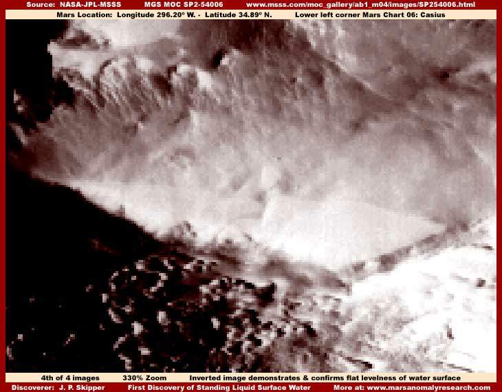 Fontos megérteni a felfedezés jelentőségét, amire itt hivatkozunk, hiszen jelen esetben víztömegekről van szó, úgymint tavakról, patakokról és hasonlókról. Mindez nem cserélendő össze a marsi víz első felfedezésével, ami Dr. Leonard Martin nevéhez, a Lovell Obszervatórium – Flagstaff, Arizona – tudósához köthető, aki az 1978-ban a Viking űrszondák által készített, 775A10 és 775A11 jelű képeken gejzíreket, illetőleg feltörő víz árnyékát vélte felfedezni a Mars Solas Planum nevű térségében. Aki minderről bővebb ismereteket szeretne: a felfedezésről a NASA Activities Bulletin 1980-as, decemberi, 11. kötete számol be. Valójában a nyíltvizű felszíni marstavakról szóló felfedezés még csak nem is a jelenleg tárgyalt felvételhez köthető, Skipper ugyanis az MO4-00291 jelű képen már hasonlóra akadt, s erről beszámolt „Az igazi füstölgő fegyver: élet van a Marson” (#001), viszont mindenképpen elsőnek számít a nyilvánosságra hozott, idevonatkozó felfedezések sorában. Az említett írás ugyanis minderre nem fektetett kellő hangsúlyt, mint ahogy a civilizációs nyomokra sem, hiszen akkoriban, 2000 júniusában, még meglehetősen úttörő vállalkozásnak bizonyult ilyesmiről írni, még akkor is, ha az a beszámoló nem a széles nyilvánosság számára készült. Az akkori beszámoló tehát jelentős kiegészítésre szorul. Akkoriban még Skipper meglehetősen tapasztalatlan volt e téren, mi igaz és mi nem a Marssal kapcsolatban, és megpróbálta a hagyományos felfogást követni a bolygó felszíni vizei és a lehetséges élet kapcsán beszámolóiban. Úgy gondolta, hogy két ilyen ellentmondásos téma együttes felvetése akkoriban, és a MOC űrszonda által sugárzott felvételek elemzésének eredménye, egyesek számára túl sok lehet a látottak elfogadásához és esetleg hajlamosak minderre elutasítóan reagálni, „belemagyarázásnak” venni a tényeket, és elfogadni, a sokkal kényelmesebbnek és biztonságosabbnak tűnő hivatalos álláspontot. A tény az, hogy az átdolgozott és később nyilvánosságra hozott, Skipper-féle #001 jelű beszámoló a marsi élet lehetőségéről már sokkal kevesebb ellenállásba ütközött, mint a korábbi verzió a felszíni vizek kapcsán. Mindez azért következhetett be, mert a korai változat meglehetősen hipotetikusan kezelte a nyilvánvaló dolgokat, ezt egyesek hibázási lehetőségnek vélték. A bejelentés így izgalmasabbnak hangzott, de sokkal inkább támadhatóvá vált, ezért az olvasók és a kutató-szervezetek – pszichológiai okokból – hajlamossá váltak nem túl komolyan venni az egészet. Ha szükséges valamiféle pszichológia stratégia az ilyen jellegű felfedezések bejelentésével kapcsolatban, akkor minden bizonnyal érdemes az olyan kifejezésektől tartózkodni, mint „marscsatornák”, vagy „marsi férgek”, ugyanis a vörös bolygóval kapcsolatban kialakult koncepciók miatt az emberek hajlamosak az ilyen kifejezéseket tartalmazó beszámolókat már eleve nem komolyan venni és félretenni. Így bizonyos olvasók számára egyfajta hátsó ajtó nyílik, ahol elmenekülhetnek a tényekkel való szembesülés elől, az elől, hogy az eddigi ismereteiknek ellentmondó tényeket kezelni tudják, a menekülésük révén pedig biztonságosabban érezhetik magukat a hivatalos álláspont mögé felsorakozva. Másrészről, amint arra ebben a beszámolóban kísérletet teszünk, rendkívül fontos az olvasó számára kemény és egyértelmű bizonyítékot adni, és nincs helye úgymond „mellébeszélésnek”, ami megzavarhatja még a jó szándékú kutató elméket is. Létfontosságú a folyékony víz felszíni jelenlétére koncentrálni, nem törődve azzal, hogy a puszta tény milyen kétségeket támaszt egyesekben, főleg a – hivatalos források által – évtizedek óta folyamatosan kondicionált elmékben. Más szavakkal: az egyértelmű, jól látható tudományos bizonyítékok önmagukért beszélnek, nem igényelnek különösebb kommentárokat, olyan tiszták és egyértelműek, mint a jelenleg tárgyalt képeken észlelhető tó vize. Az ilyen súlyú bizonyítékok meglehetősen kellemetlen helyzetbe hozzák a hivatalos álláspontot képviselőket és befolyásoltjaikat, kifejezetten fenyegeti szavahihetőségüket, kényelmes és évtizedeken át hangoztatott álláspontjukat, miszerint a Mars felszíne csontkeményre fagyott, száraz és poros, és olyannyira halott bolygó, amennyire csak egy égitest egyáltalán lehet. Az ilyen álláspontot hangoztató számára egész egyszerűen nincs helye a Marson folyékony víznek, azonnal elvetik, hiszen ellentmond a hivatalos hitrendszernek, viszont nem meri a hivatalos álláspontot megkérdőjelezni, azt kinyilvánítani – a puszta tények létével -, hogy a hivatalosan megadott hőmérsékleti adatok alapból valótlanok. A felsorakoztatott tények fenyegetik a „status qou”-t, emiatt – nyilvánvalóan – sokak számára elfogadhatatlanok.