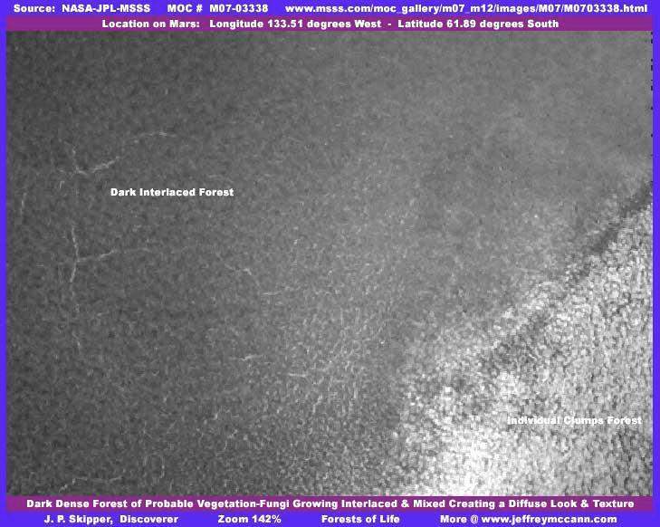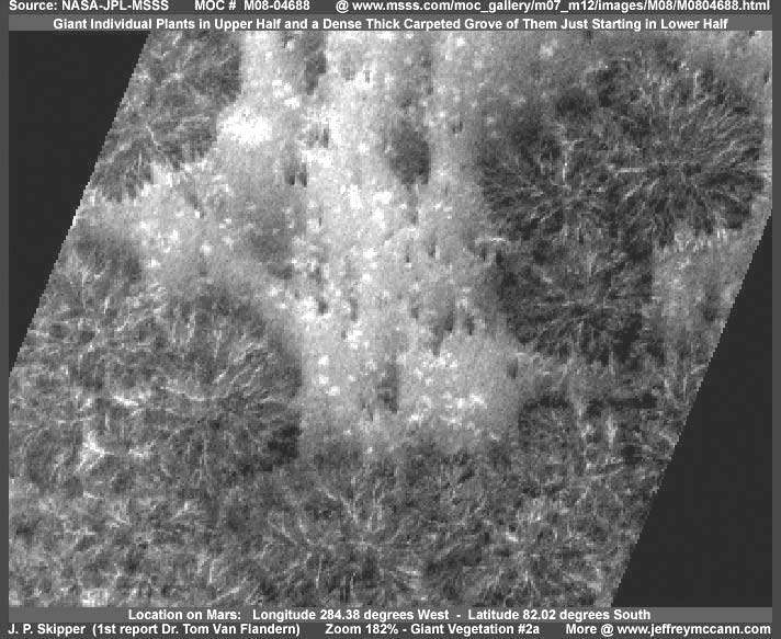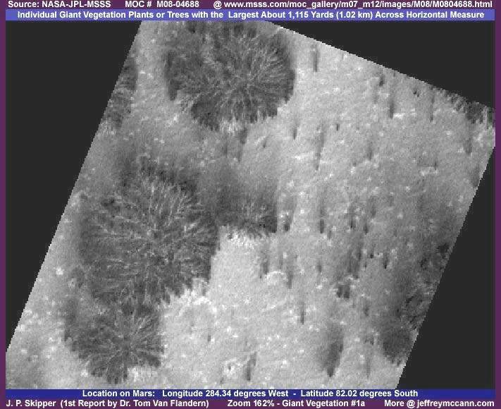 Amint az első két képen nagyszerűen látható, a feltűnő alakzatok igencsak hasonlatosak növényzethez, netán valamiféle fás-jellegű élőlényekhez. Ez az első ilyen, növényzetet bemutató fotó, és egyben az első ennek a bizonyos fajnak marsi előfordulásáról. John Skipper is talált olyan marsfotót, ahol ez a növényfaj megtalálható a hivatkozott sajtókonferencia előtt néhány hónappal, azonban azon a felvételen korántsem volt olyan tiszta a látvány, mint ezen, így nem számolt be felfedezéséről, abban a reményben, hogy lehetősége lesz egyértelműbb bizonyítékokat is találni, mielőtt beszámolna saját felfedezéséről e faj kapcsán. E növényi faj első felfedezésének dicsősége kérdés tehát, de fontos és megválaszolandó kérdés. Nem gondolom, hogy a felfedezés elsősége Dr. Van Flandern nevéhez, vagy kutatótársaihoz lenne köthető. Úgy gondolom, erre a bizonyos fotócsíkra más hívta fel a figyelmüket, egy igencsak híres ember, aki meglehetősen visszahúzódó atekintetben, hogy ilyesféle munkákkal összekapcsolják a nevét, s éppen emiatt, felelősségteljesen nem szabad itt leírni. Az igazat megvallva azonban örülhetünk neki, hogy elkerült ez a fotócsík Dr. Van Flandernhez és csapatához, és nagyon örülhetünk annak is, hogy Dr. Van Flandern be is mutatta egy sajtókonferencia keretében. Csak remélhetjük, a dolognak komolyabb folytatása lesz, a média számára megvan a lehetőség, hogy felkarolja a témát. Hogy a felfedezés mennyire fantasztikus? A Malin Űrközpont (MSSS) honlapján megadott paraméterek szerint a fotócsík szélessége 2.83 km. A mellékelt képek közül az első a legnagyobb növény, baloldalt alul, a legszélesebb pontján eléri a 36%-át a teljes képszélességnek, ami egyenlő azzal, hogy a növény átmérője ezen a ponton 1020 méter! Igen, jól olvasták, több mint egy km átmérőjű! Tudom, mindez lenyűgöző. El tudja Ön képzelni ezt a hihetetlenül nagy növényfajt? Vajon miként festhet, akár nagyobb távolságból is, amikor közelítünk felé? Olybá tűnhet, mintha egy kisebb hegy felé haladnánk. Az ember csak fantáziálhat azon, hogy egy-egy ilyen teremtmény milyen elképesztően öreg lehet, és talán még ennél is megdöbbentőbb lehet fajának ősisége. A jelen sorozat két első felvétele azért került kiválasztásra, mert a rajtuk látható egyedek aránylag egyedülállóak és függetlenek társaiktól, ezért tisztábban vehetjük szemügyre tulajdonságaikat, és mérhetjük meg átmérőjüket. E növények vagy fák magasságáról nem sokat tudunk mondani, habár több felvétel áll róluk rendelkezésre, ezek annyira kétértelműek, hogy semmi konkrét és pontos adatot e tekintetben nem tudunk megadni.