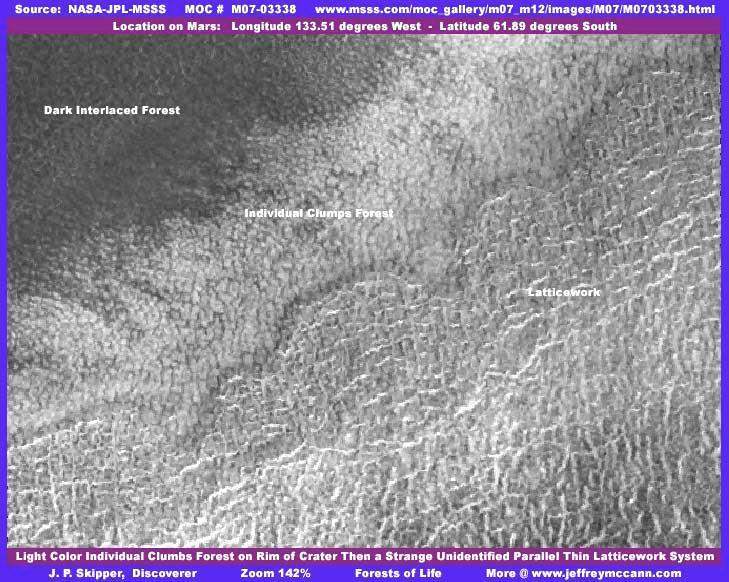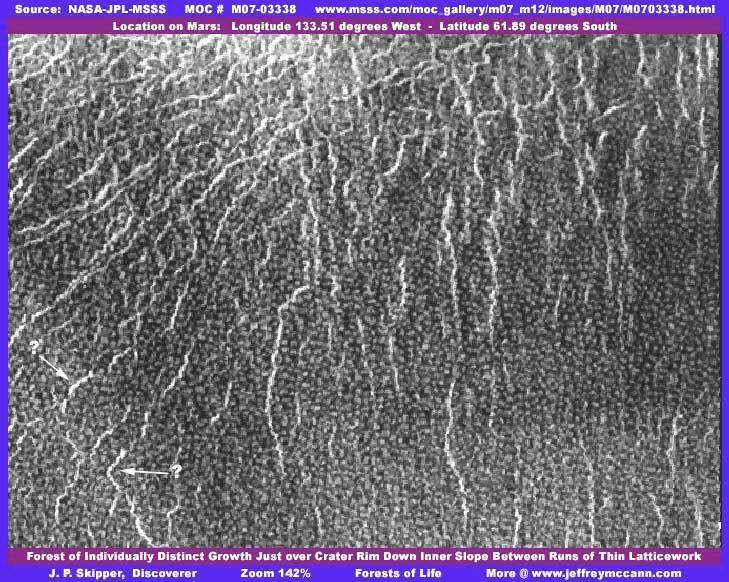 Amikor először Skipper felfedezte jelen képcsíkot, arra gondolt, hogy a harmadik felvételen látható az egyedi objektumok hatalmas tömege (mely tovább nyúlik lefelé a fotócsíkon), a feljebb látható, a kráter vonalán sűrűn benőtt szigeteket alkotó növényzet kevésbé kifejlett formái. Valahogy kissé emlékeztetnek azokra a növényekre ebből a szögből, hasonlóak a szomszédjaikhoz képest való elhelyezkedésben, a szabad távolságtartásában. Hasonlóan a növényi telepekhez, széleiken sokkal jobban leírhatók, mint például egy sűrű erdő közepén, mint amilyent a fotócsík felső részén látunk. Arra gondolhatunk a kráter belsejében lévő növényzet alacsonyabb, talán az eltérő környezeti feltételek miatt, melyeket a lágyan lejtő belső kráterfal szolgáltat, kevésbé megfelelő élettér, és ezért kevésbé fejlettek az itt élő növények. Vagy esetleg teljes mértékben eltérő növényzetről van szó, vagy pedig ugyanannak a fajnak más típusáról. Mindezeknek is megvan az esélye. Azonban a felfedező, John Skipper emlékezett arra, hogy ez a határozottan kisebb objektumokból álló mintázat nem jellemző az M08-04110 fotócsíkon található növényzetre, főleg nem ilyen jelentős sűrűségben. Az itt bemutatott harmadik képrészleten az objektumok sűrűsége igen nagy, közel duplája az ott megfigyelhetőnek! Emlékeztetni kell arra is, hogy az M08-04110 jelű képcsíkon megfigyelhető biológiai életnyomokat nem fedték fel a nyilvánosság számára, ahogy a vele együtt megfigyelhető civilizációs jeleket sem. Ez pedig, ahogy a felszíni folyékony víz, s a körülötte burjánzó élet jelenléte is, csak egyet jelenthet, mindez szándékosan történt így, meghagyták másoknak a felfedezés örömét, miközben a felvételeken folt- és terület hamisítási technikákat alkalmaztak. Más szavakkal, végül is meghagyták a felfedezés lehetőségét a kutatók számára, miközben hivatalos részről folyamatos tagadásba ütközhetünk, legalábbis ebben a pillanatban. Esetleg továbbmentek egy lépéssel, és valamiféle növényzet hamis illúzióját kreáltak ide, ahol igazából nincs is semmi, miközben valami egészen másról akarják elterelni a figyelmet? Mindez a gyanú annyira erős volt a felfedezőben, hogy visszatért újra, s alaposan szemügyre vette a felvétel részleteit. Az első dolog, ami észrevehető, hogy habár különbség van az egyedi sötét objektumok átmérője között, a nagyobbak nagyjából dupla méretűek, mint a kisebbek, a kiterjedésük ezen a szigorú mérethatárokon belül marad. Továbbá, itt van ez a nagyon határozott magassági faktor és az állandó távolság az egyes telepek között. Még ebből a távolságból is és a szándékosan elhomályosított képrészlet ellenére is igen jól látszanak korvonalaik, a nagyobb növénytelepeknél még inkább tetten érhetjük e jelenséget. Vagyis, az első ránézésre véletlenszerű mintázat nagyon is sok szabályosságot és szabványosságot rejt. Természetesen mindezek a jelenségek igazak lehetnek növénytelepekre is, nem kell feltétlenül civilizációs nyomokat sejteni mögöttük. Á, miközben a lefelé irányuló világos színű vonalak láthatóan a kráter lejtőjét követik, egyenesen ereszkednek alá, nagyobb látószögű rálátás esetén, a kép bal alsó sarkát figyelembe véve (nyilakkal jelezve) azt láthatjuk, hogy ezen vonalak egy része rendkívül kicsiny egyéni objektumok sorozatából áll, sokkal inkább, mint hosszú, egymásba gabalyodó objektumok rendszeréből, ahogy azt az első pillanatban sejtettük. Lehetnek ezek épületek, vagy ahhoz hasonló struktúrák láncai, közvetlen kapcsolatban a kráter lejtőjén aláfolydogáló vízzel? Ha veszünk egy épülethalmazt és jó messzire eltávolodunk tőle, akkor elkezdenek összemosódni, összefolynak, és úgy látszanak, mintha folyamatos sűrű szövevényt alkotnának. Vajon ugyanez történik itt is? A MOC felvételein számos alkalommal találkozhatunk ezzel a felbontás-rontó elfedési technikával, például a kráterfalon felfutó épületsor és a víz jelenlétének felfedezése kapcsán, a felbontás lerontásával és némi ködösítéssel máris úgy tűnik, mintha geológiai alakzatokat látnánk, egy lejtős kráterfalhoz idomulva. A nagyobb vízfelületekre mindez a technika természetesen nem hat, azonban az épületek vonatkozásában a beavatkozás drámai formát ölt, teljesen besimulnak a geológiai tényleges formák közé. Nem hagyhatjuk figyelmen kívül az utakat sem (sötét folyosókat is észrevehetünk) ami a közlekedés egy magasabb formájára enged következtetni. Ha figyelembe vesszük az objektumok különféle formáját és eltérő megjelenését, mindezt magyarázhatjuk társadalmi tényezőkkel is, hiszen nem szabad elfelejtenünk, ez egy másik világ, nem a Föld, és minden világnak megvan a maga fejlődési útja. Nos mindez csak feltevés, nem akarjuk itt azt mondani, hogy a képen épületek vannak, merthogy ezt nem lehet eldönteni. Azt sem lehet határozottan kijelenteni, hogy mindez a képhamisítás eredménye. A felbontás egyszerűen túl gyenge ilyen kérdések eldöntéséhez. Mindössze azt szeretnénk érzékeltetni, hogy meglehetősen erős a gyanú, miszerint a harmadik képen esetleg mesterséges eredetű struktúrákat láthatunk, sokkal inkább, mint növényeket. Mindezt a feltételezést a MOC űrszonda felvételeit rendszeresen meghamisító technikák tettenérésére lehet alapozni, melyet a felvételek tömegén érhetünk tetten, amit nyilván azzal a céllal alkalmaznak, hogy senki és semmit ne ismerhessen fel, amit nem kellene. Csupán annak lehetőségére szeretnénk itt felhívni a figyelmet, hogy a mesterséges eredet mint egyik értelmezési lehetőség komoly súllyal esik latba. Amit egyértelműen kijelenthetünk, amit