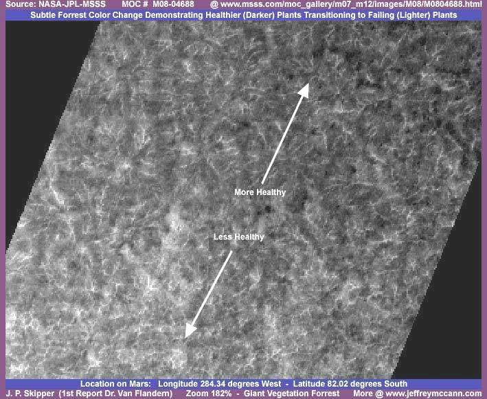 A negyedik és egyben utolsó felvételen a teljes fotócsík látható, aránylag kis felbontással, az áttekinthetőség kedvéért. Az ok, ami miatt ide illesztettük nem az, hogy az első és a második képrészlet pontos elhelyezkedését viszonyítani lehessen, hanem sokkal inkább az, hogy a kép felső részén milyen erős és sűrű az erdőség, és a színe is milyen erőteljes és egyenletes. A sötétebb szín életképesebb és egészségesebb vegetációt jelöl, a halványodó szín pedig, ahogy tónusa mindegyre csökken, egyre betegebb, halódóbb, esetleg már el is pusztult vegetációt. Az ide illesztett fotócsík azt hivatott demonstrálni, hogy a képen különböző egészségi állapotban lévő növényzetet láthatunk, ami egyben arra is bizonyíték, hogy itt valóban élő és dinamikus növényi élettel van dolgunk. Amikor az ember megérti, milyen erős felépítésű és hatalmas minden egyes egyed, akkor elképzelhető az is, miként fest egy elpusztult példány, akár egy hegynyi méretű, össze-vissza gabalyodott anyagtömeget látnánk magunk előtt, sokuk teljes kaotikus rendszerbe egymásba gabalyodva, esetleg összekeveredve a még élő növényzettel, ahol a felszínt akár hegynyi méretekben is ezek a hatalmas, pusztulófélben lévő növényi tömegek, illetve a már rájuk települt új, és virágzó egyedek alkothatják, a tényleges felszín pedig valahol ezen egymásra települt hegynyi rétegek alatt a mélyben, teljesen láthatatlanul. Sikerült további fotócsíkokra bukkanni, ahol ugyancsak a pusztuló növénytelepeken sarjadó, de más növényfajok rátelepedése, gyökeret verése révén kialakult vastag szőnyeget láthatunk, ily módon más jellegű erdőt alakítva ki, ahol az egyes növények átmérője és a köztük lévő távolság is igencsak szabványos megjelenést ad számukra. Valóban, a Mars csodálatos hely és sokkal változatosabb, mint amilyennek a fantázia fel tudja ruházni. Még egy dolgot meg kell itt jegyezni. Az itt látható faj elpusztult egyedeit igazából semmi sem különbözteti meg kinézetre az élő példányoktól, csak a színük, illetve az ágaik nem tartják továbbra megszokott, szabályos rendet, sokkal inkább összekuszálódottak. Ha itt valóban fákat láthatunk, hatalmas rönkökkel, mint ahogy azt a Földön megszoktuk, akkor jogosan várnánk el, hogy legalább egy néhány lehullik körülöttük, amikor a fa törzse gyengül növény pusztulása folyamán. Mindennek a jelenségnek a felvételeken nyomuk sincs a halódó, vagy már elpusztult növények környezetében, de mindez hasonlít azokhoz a gigantikus növényekhez, melyek sugárirányban nőnek egy központi telephelytől, utat törve maguknak, a hasonlóan masszív felépítésű növényekből álló erdőben. Ez azt jelenti, hogy a törzsből sugárirányban kinövő vastag ágakat a talaj megtámasztja, a magasabban növő elágazásokat pedig az alattuk lévők. Valószínűleg rövid törzsű fákról lehet szó, szerepe inkább az ágak növekedési irányának meghatározása lehet, mint az ágaknak a megtartása, így biztosítva az ágak megfelelő növekedését és tápanyaggal való ellátásuk lehetőségét. Az is meglehet, hogy ezek a hatalmas törzsek lefelé terjednek ki jelentősebb mértékben, jó mélyre lefúrva a bolygó talajába, gyökereket mélyesztve abba víz és ásványi anyagok után kutatva? Más szavakkal, alacsonyra növő fajjal találkozhatunk itt, nem törekszik hatalmas magasságokba, ahogy azt a hatalmas telepeiből sejthetnénk. Fontos ismeret az eddigiekhez még, hogy ez a bizonyos M08-04688 jelű fotócsík a Mars Déli Pólusának környékén készült, ez a terület, hasonlóan az Északi Pólushoz, a leginkább felderített fotók alapján. Dús növényzettel találkozhatunk a Déli Pólus környékén a 75. és a 85 szélességi kör között. Ettől a területtől távolabbra, a sarok felé, már jégsapka található, ettől északabbra, az Egyenlítő felé pedig már sivatag.
