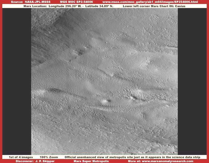 23. A Mars Szuper Metropolisza Az itt látható civilizációs nyomok az MGS MOC hivatalos adataiból valók, az SP2-54006 jelű fotócsíkról. Emlékeztetnénk arra, hogy ez pontosan ugyanaz a fotócsík, mely kapcsán először hozta John Skipper nyilvánosságra a folyékony felszíni víz marsi jelenlétére vonatkozó felfedezését, 2000. június 27-én, amint azt a 20. fejezetben olvashattuk. Ebben a beszámolóban a vízgyűjtő közvetlen környékén fellelhető civilizációs nyomokról is szó esik. Azonban abban a fejezetben csak utalás történik más fontos civilizációs jelekre az említett fotócsík kapcsán, de nem került a téma bővebb kifejtésre, hiszen elsődleges szempont a folyékony felszíni víz jelenlétének taglalása volt, a civilizációs nyomok pedig csak a vízgyűjtő közvetlen közeli térségére korlátozódtak.