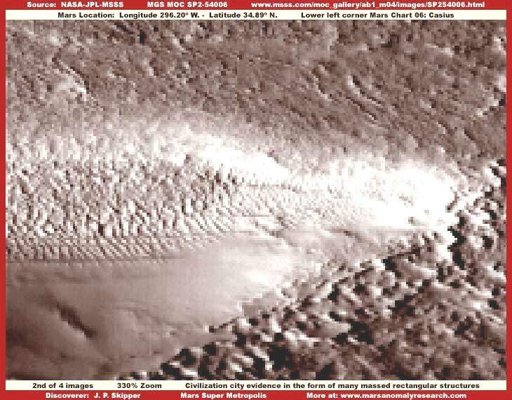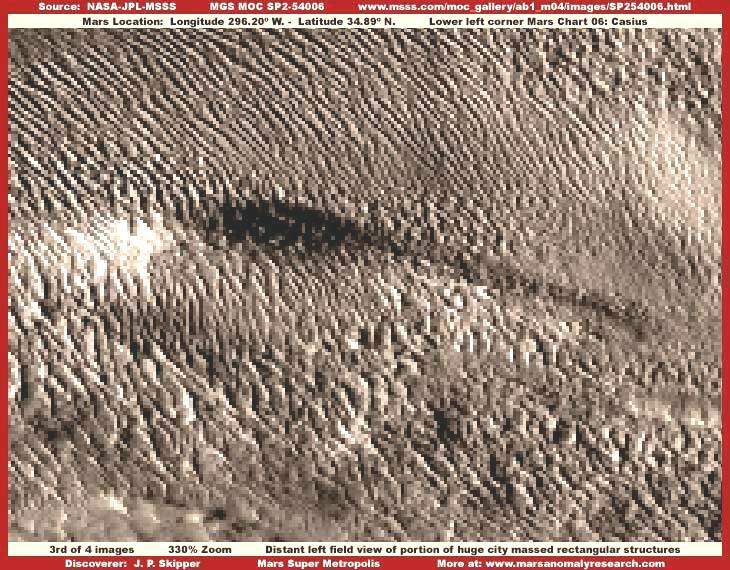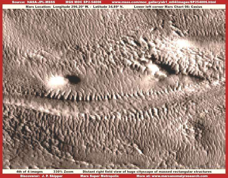 A sorban negyedikként látható fotó ugyancsak erről a területről származik, ennek a hatalmasra terjeszkedő metropolisznak egy másik részét mutatja, a harmadik képtől pontosan jobbra eső területet. Mint maga a teljes felvétel, ez a részlete is kissé zavaros az erősen bekorlátozott felbontóképesség és részben a közvetlen fotóhamisítási eljárásoknak köszönhetően, de még így is kellően tiszta ahhoz, hogy felismerhető lehessen, mivel is állunk szemben. Tisztán látható, hogy a szögletek struktúrák alkotta sorok némelyike hogyan fordul kissé szögben a kamera felé, így bepillanthatunk a sorok végeibe, és más szögben is lehetőségünk nyílik rátekinteni a rendszerre, mint a korábbi átlós. Ez ismét rácáfol arra az állításra, hogy ez a fajta civilizációs nyom valamiféleképpen a pixelezettség miatt jött volna létre, a túl erős zúm alkalmazása miatt. Két dolog miatt kapott helyet itt ez a bizonyos fotórészlet. Először is, szerettük volna érzékeltetni az olvasóval, milyen hihetetlen mértékben kiterjedt ez a terület, milyen sűrűn beépített, és milyen elképzelhetetlenül nagyok ennek a metropolisznak a léptékei. Másodszor, ez az újabb részlet ismételten bemutatja azt is, hogy igazából mi az a nagyon hosszan elnyúló, keskeny, ám tisztán kivehetően folyamatos kupolaszerkezet, mely keresztülhalad széltől-szélig a felvétel központi területén. E hosszúra elnyúló különleges kupolának a kezdete az előző, a sorozat harmadik képének jobb oldalán látható. Továbbá, egy újabb hosszan elnyúló kupola eleje látható a sorozat negyedik felvételének jobb felső sarkában. Habár túlságosan is nagy a távolság ahhoz, hogy bármiféle valós részletet felismerhessünk rajtuk, az alapvető körvonalukon kívül, ezek a hosszan elnyúló kupolaszerkezetek meglehetős gyanúra adnak okot, amint a szögletes struktúrák erdején áthaladnak. Szeretném megjegyezni ezen hosszan elnyúló kupolák kapcsán a következőket. Mivel ez az a pont, ami rendkívül fontos, különösen e hatalmas metropolisz, de más marsi városok kapcsán is, melyekről más fejezetekben is szó esik, hiszen valamennyien – láthatóan – szabad ég alatt vannak, semmiféle védőburok nem óvja őket, például valamiféle kupola. A felvetés teljes és alapos átgondolása révén megérthetjük, hogy ez a fajta civilizációs nyom fontos üzenetet hordoz számunkra, és pedig azt, hogy a hivatalos verzió, a Mars csontkeményre fagyott állapotáról, a száraz és poros mivoltáról, arról, hogy olyan halott égitest, amilyen halott csak egy égitest lehet, ahol bármiféle élet léte elképzelhetetlen – bizony hamis. Továbbá, súlyos kérdéseket vet fel a Mars fizikai paramétereire vonatkozó tudományos adatok megbízhatóságát illetően. Továbbá, mindez újabb megerősítést ad a felszíni folyékony víz létezésére, tényről már esett szó és a későbbiekben is fog. Annak ellenére, hogy hiányzik a kellően jó felbontás következtetéseink levonására, az általánosságban jó állapotúnak mondható szögletes struktúrák tömege, igazolhatja azt a feltételezésünket, hogy nagy valószínűséggel jelenleg is aktív civilizáció nyomait láthatjuk, méghozzá rendkívül sűrűn lakottat. Van azonban egy kellemetlen tényező a ilyesfajta nyomokkal kapcsolatban, ez pedig az, hogy néhány földi megfigyelő számára mindez igen zavaró. Ilyen zavaró tényező a következő teoretikus kérdés, hogy vajon volt-e a Marson intelligens élet? Addig semmi gond, amíg erre a kérdése igennel válaszolunk, de a válaszunk időpontjára vonatkozóan a beláthatatlanul távoli múltba nyúlunk vissza. A dolog egyből megváltozik, ha kőkemény, szemmel látható bizonyítékot kapunk a Mars felszínén élő, jelenleg is aktív civilizáció létezéséről. Akár hogy is, a Mars nincs annyira messze tőlünk, erről nem szabad megfeledkezni, sokkal nagyobb száraz terület áll rendelkezésre benépesítés céljára, mint a Földön, a 72% óceán uralta bolygón, megmaradó; ráadásul nálunk a gravitáció is sokkal erősebb. Néhányan bizonyára zavarónak és kényelmetlennek találják az effajta civilizációs nyomokat és ezért nehézséget okozhat számukra a fotók objektív elemzése, és ez esetben teljességgel lényegtelen számukra milyen erős vagy tiszta a bizonyíték. Ugyanis, ha civilizációk találhatók a Marson, amint azt ez a bizonyíték is megerősíti, akkor ez már a valóság részét képezi, és teljességgel lényegtelen az, hogy hajlandók vagyunk-e ezt elfogadni vagy sem; a történelem pedig arra tanít bennünket, hogy a valóság előbb-utóbb felülkerekedik mindenféle hamis koncepción. Továbbá, amennyiben ez a realitás, márpedig ez, akkor minden bizonnyal valamiképpen hatni fog az életünkre, egyelőre számunkra ismeretlen módon, akár elfogadjuk ennek a valóságnak a létét, akár nem. Valamivel enyhébben fogalmazva, a „figyelmen kívül hagyás” nem járható út az új valóság megismerése kapcsán, ami azt jelenti, fel kell ébrednünk és szembesülnünk kell vele. Csak emlékeztetőül: az összes itt található vizuális nyom független kutatóktól származik, döntő többségükben John Skippertől, a bemutatott adatok 100%-ban leellenőrzöttek és leellenőrizhetők, a NASA, a JPL és az MSSS saját tudományos archívumaiban. Tehát nem valamiféle kreált vagy manipulált adathalmazt teszünk itt közzé. Viszont ezen ismeretek közzététele lelkiismereti kötelesség is.