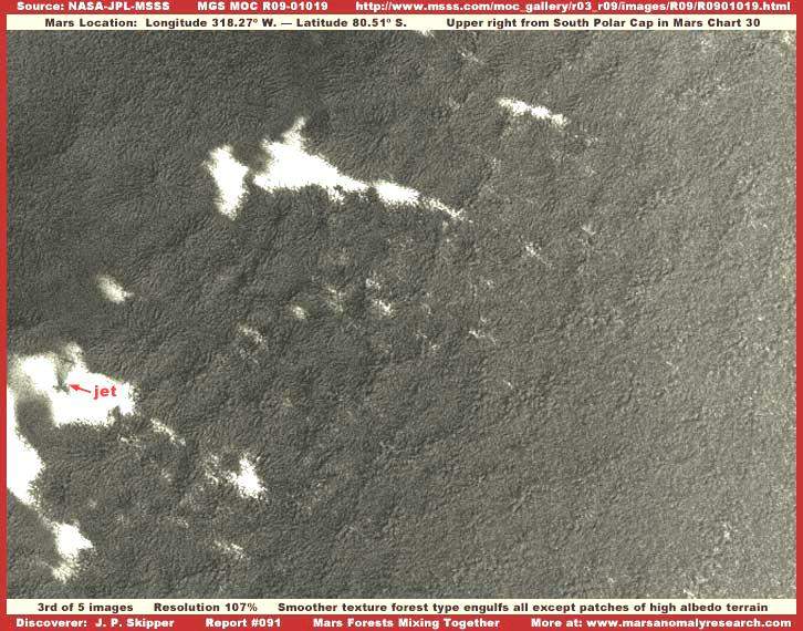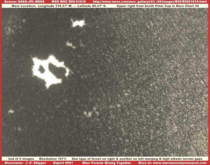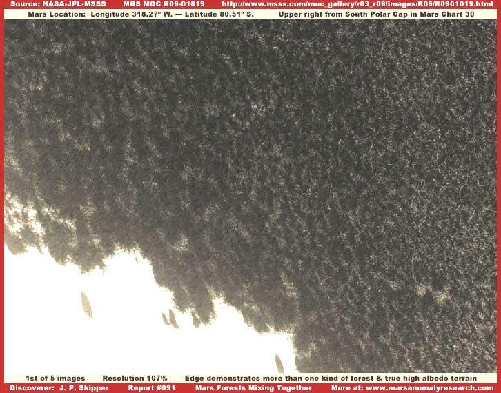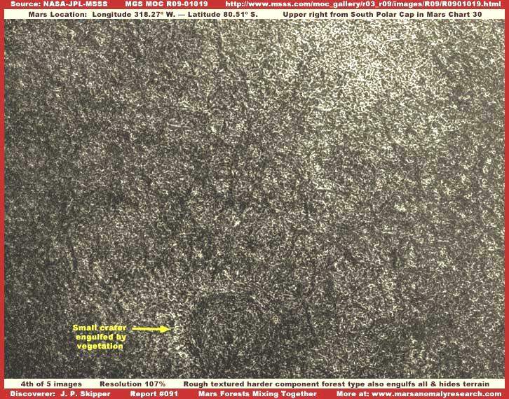 Könnyen kapcsolatot találhatunk az itt látható erdőség és a „További erdők és tavak a Marson” című beszámolóban bemutatott erdőség között, felvethetjük, talán ugyanannak a fajnak különböző fejlődési állapotát látjuk, a jelen sorozat harmadik képe tovább fokozhatja e meggyőződésünket. Hasonlóan az ott látottakhoz, ez az életforma is a fotócsík felső részén található, hasonlóan ahhoz, teljesen elfedi maga alatt a felszínt. Nos, kivéve a jelentős fényvisszaverő-képességgel rendelkező felszíni foltokat a baloldali részen, melyek az erős és közvetlen napsugárzásról tesznek tanúbizonyságot, figyelemreméltó, hogy a sötét terület elnyeli a fényt, és semmivel sincs nagyobb fényvisszaverő-képessége mint a fotócsík többi részén, illetőleg a Mars más tájain felbukkanó erdőségeknek. Az is megjegyzendő, hogy a jelenleg vizsgált növénytakaró alacsonyabb növésű, az összehasonlításban felhasználható „További erdők és tavak a Marson” című beszámolóban foglalthoz képest, és jól kivehetően az ágas-bogas nyúlványai révén terjeszkedik. Azonban az is megjegyzendő, a felszíni adottságok is különbözőek, a fenti kép jobb alsó részén világosabb foltot látunk, ez annak a következménye is lehet, hogy mélyebben bepillanthatunk az ágas-bogas felépítés alsóbb régióiba, ahol már durvább formák is akadnak. A néhány kisebb, erősebb fényvisszaverő-képességgel rendelkező terület a sötét növénytakaró jobb alsó szélén igazából nem esik messze a növénytakaró erősebb fényvisszaverő-képességgel rendelkező típusának határterületétől, egyik legjellemzőbb ilyen övezet a sorozat alábbi képén látható.