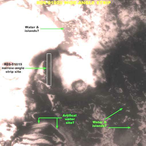 A fent látható ötödik felvétel a keskenylátószögű R09-01019-es fotó tágabb környezetét mutatja a széles látószögű R09-010120 jelű felvételen bejelölve. Vizsgáljuk meg alaposan az R09-01019-es felvétel tágabb környezetét. A széles látószögű felvétel nem szolgál további bizonyítékkal, szintén az erősen bekorlátozott felbontásnak és a nagy távolságnak köszönhetően, azonban bizonnyal érdekes az olvasó számára, ha szélesebb rápillantást kaphat az adott területre, főleg azért, mert a környezet minden jel szerint vízzel fedett. Sőt, valójában igen szokatlan képződményt láthatunk a felvétel bal alsó részén, hosszú, keskeny szárakkal kialakított, tökéletes „V” betűt formázó alakzatot, pusztán formája már erőteljesen utal mesterséges eredetére. Akár az egész környéke lehet mesterséges kialakítású. Érdemes bal oldali, jóval fényesebb szárát külön is megvizsgálni, első ránézésre úgy tűnik, mintha az erős fényvisszaverő-képességű rész vízpart lenne, egyfajta vízlépcsőt alakíthattak itt ki, vagy valami hasonlót. Rendkívüli jelentőséggel bíró nyom.