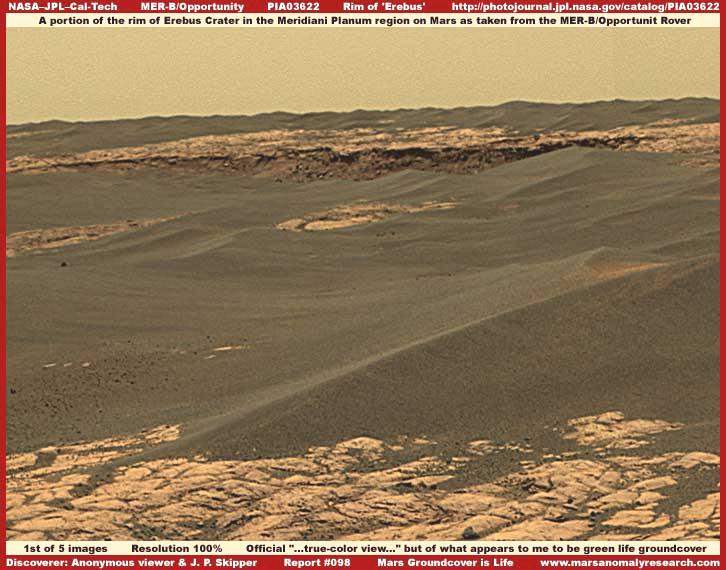 A sorban látható első kép tökéletesen azonos a hivatalos forrásokban megjelenttel, mindössze a méretét csökkentettük le egy kissé, hogy jobban beilleszthető legyen a beszámolóba, ezen kívül semmiféle változtatást nem eszközöltünk, még csak a kép élességét sem növeltük. A felvételen látható színek pontosan azonosak a hivatalosan megjelentetett, és a következő hivatkozással ellátott „…hozzávetőlegesen valós színek” összeállítással. E kép minderről igen sokat elmond, legalábbis véleményem szerint, és ezt a JPL-nél is így gondolhatták. Miért? Nos talán azért, mert ezt a fotót nem akarták közzétenni. Hosszú története van annak, hogy mégis elérhető, és ennek hitelességéről bárki meggyőződhet. Íme a történet: A jelek szerint a JPL honlapján 2005. december 5-én felbukkant egy felvétel az Opportunity panoráma-felvételeinek sorában, a következő felirattal: „Az Erebus lejtője”, a mellékelt fotó kíséretében. John Skipper figyelmét a fotó felbukkanására egy, névtelenségét megőrizni kívánó, hosszú évek óta fotók elemzésével foglalkozó társa hívta fel, arra a következtetésre jutva, hogy a képen fűtakaró látható. A fotó megtalálója azt is hozzátette, a kép és a hozzá csatolt hivatalos kommentár már másnap este eltűnt a honlapról, elérhetetlenné vált innentől kezdve a továbbiakban is, a dolog pedig ettől a ponttól kezdve kezdett igazán érdekessé válni. Később felbukkant ismét egyhivatalos link a megadott 2005.12.05-ös felvételre, de immár kissé megváltoztatott kommentárral, mint az „Opportunity panoráma felvétele az ’Olympia’ nevű alapkőzet-felbukkanásról”. A felvétel a következő linken érhető el: http://origin.mars5.jpl.nasa.gov/gallery/panoramas/opportunity/2005.html Köszönhetően a fotóelemző társnak, a felvétel tehát felkeltette Skipper figyelmét, aki gyorsan akcióba is lépett és sikerrel és főleg gyorsan letöltötte a képet és a hozzá tartozó kommentárt, mielőtt azt eltávolították volna a JPL honlapjáról. A dátumból látható, mindez 2005. karácsonya és Újév között történt, az ünnepek időszakában, amikor – hasonlóan más helyekhez – a biztonsági előírások szigorúsága bizonnyal lazább, nagy valószínűséggel a legmagasabb beosztású szakembereik is máshol tartózkodtak, és az is határozottan kijelenthető, jelen volt tekintélyes arányú hozzá nem értés is. Nos, a hivatalos „Az Erebus lejtője” jelzésű cikket eltávolították hát az Opportunity első számú honlapjáról, és kicserélték a fentebb jelzett képpel, illetve beszámolóval, azonban e manőver végrehajtói elfeledkeztek arról, vagy egész egyszerűen nem voltak tudatában(?) annak, hogy a botok automatikusan felveszik és továbbítják az anyagot a társult szervezetek honlapjára, úgymint NASA/JPL/CallTech, mint ahogy például az alábbi címre is. Pontosan ezért, mivel csak az Opportunity fő oldaláról törölték a képet, az továbbra is hozzáférhető maradt, de ekkorra már elkéstek, a felvétel nyilvánosságra hozatala megtörtént. http://www.jpl.nasa.gov/missions/mer/images-print.cfm?id=1835 Elképzelhető, hogy a fenti linkre hivatkozva valaki esetleg hibaüzenetet kap, ám az is megtörténhet, „most már úgyis mindegy” – a alapon, hogy az érdeklődő megtekintheti az eredeti felvételt az eredeti kommentárral. Amikor valaki ismételten megpróbált a - 2006 elején legalábbis – felvétel hivatkozására kattintani, általában ez történt. Különböző számítógépeket használva a megjelölt oldal elérése mégiscsak sikerült, sorozatos próbálkozásokat követően. Úgy tűnik, a háttérben és titokban működő hatalom megpróbált mindent elkövetni, az eredeti felvétel megtekinthetősége érdekében, és miután kudarcot vallottak, visszaállították a közel eredeti állapotot. Egyfajta figyelmeztetés? Netán technikai hiba? Ki tudja? Ám mindenesetre meglehetősen homályos dolgok ezek. Mindeközben a JPL honlapról letörölt felvételt megjelent a NASA Planetary PhotoJournal Internetes oldalán is, mint ahogy azt az alábbi hivatkozás jelzi. Ez a fotó jelenleg is elérhető, habár felbontóképessége nem olyan jó, mint az elméletileg sokkal jobb felbontó-képességű TIFF felvételnek, ám szerencsére az is megtalálható. A hivatkozás tehát: http://photojournal.jpl.nasa.gov/catalog/PIA03622 Másrészről, hogy a dolog még izgalmasabb legyen, jelen beszámoló megjelenésekor a fentebb látható két JPL/NASA hivatkozás hetekig nem működött, vagy ha olykor mégis, akkor sem folyamatosan. Mindenesetre a PhotoJournal felvétele bizonyítja, hogy legalábbis létezik ez a felvétel. Valamelyik, vagy szerencsés esetben mindhárom, fent beidézett hivatkozáson a kedves olvasó saját maga is meggyőződhet arról, hogy milyen színű a Mars bolygó felszíne a hivatalosan meghatározott „…hozzávetőlegesen valós színek” láttatása esetén. Ez a fajta eljárás meglehetősen különös, különösen annak fényében, hogy Skipper elég gyors volt ahhoz, hogy az eredeti felvételt letöltse és közzé is tegye beszámolójában. Nyilván az is érdekes, a hivatalos hozzáállás miként változik mindezek hatására. Természetesen szemmel tartják a kutatók levelezéseit, különösen azokét, akik ilyesmivel foglalkoznak, nyilván, a felvétel Skipper által történt megszerzését követően sok választásuk nem maradt. Aszerint is jártak el. Skipper mindezek tudatában, szándékosan él bizonyos fogásokkal levelezéseiben, és rendszeresen csapdát állít a „hivatalos források” szerkesztőinek. Nyilván ellentmondásba kerültek, hiszen tudomásukra jutott Skipper megszerezte a hanyagságból feltöltött képet, azután kivárt. Hiába távolították el az Internetről az ominózus képet, mégi