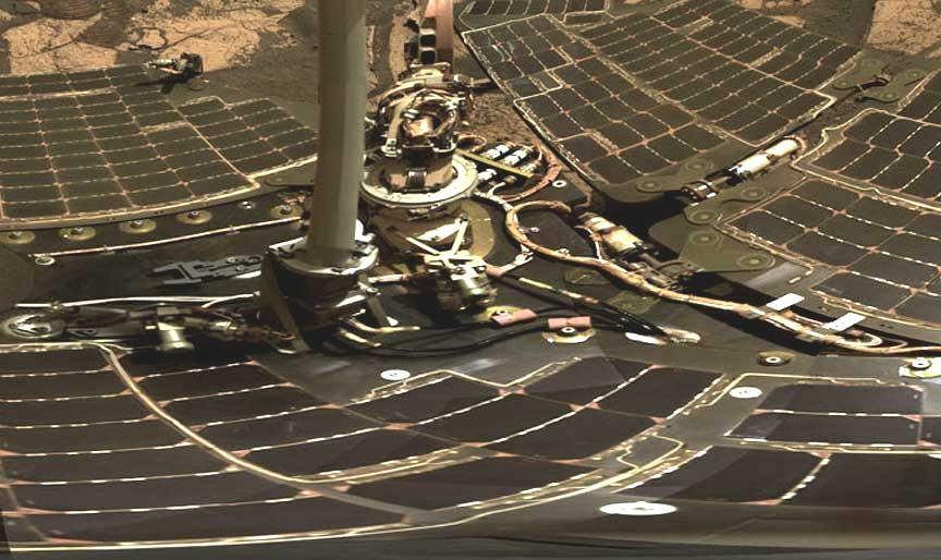 A harmadik képen a rover változatos felső részének egyik részletét láthatjuk igen közelről. Rendkívül fontos, ezért fokozottan kihangsúlyoznám a marsjáró teljesen szokatlan, egészen rendkívüli tisztaságát, mintha csak ebben a pillanatban gördült volna ki a laboratóriumból, vagy a kiállítási terméből. A marsjáró minden egyes négyzetcentimétere hasonlóan tiszta. A jelen képen nem látható részek is. Ne felejtkezzünk el róla, olyan járműről van szó, mely már – elméletileg - hosszú évek óta a Mars környezeti hatásainak van kitéve, egyfolytában, és még csak időlegesen sem állhat be egy parkolóba, vagy pedig egy jól védett garázsba. Csodálatos módon, képes arra, hogy ilyen körülmények között folyamatosan tevékenykedjen, az állítólag száraz, poros és durva felszínen, ahol gyakoriak a homokviharok, ráadásul mindezt már többszörösére meghosszabbított élettartam alatt. Amit látunk az nagyjából horizontális felvétel, így nem láthatjuk kellő mértékben a felszín állítólagos porcsapdáit, melyekből a meg-megélénkülő szél következtében folyamatosan porral teli kellene hordva lenni a marsjáró felszínének. A valóságban viszont nem így van. Most már ugye lassanként láthatóvá lesz, hová is akarunk kilukadni, ugye? Arra kérem az olvasót, kicsit tekintsen önmagába és nézze át, mit is gondol erről az egészről. Tényleg hajlamosak vagyunk elhinni, hogy ez a mára már meglehetősen öreg berendezés, amely az akárcsak az óramutató körbe-körbe mászkál a Mars rideg felszínén és elméletileg rohamosan közelít éltet tartama végéhez, a feltételezhetően rendkívül száraz, poros környezetben, túlélte az utazást a világűr vákuumában, és a leszállást a marsi légkörön keresztül, és azután elküldte ezt a hihetetlenül jó állapotáról tanúskodó fotót? Nem tudom, kinek milyen gondolat fogalmazódik meg a fejében, azt tudom, hogy ha valaki hihető felvételt szeretne közrebocsátani a Mars bolygóról, akkor távol esne tőle, hogy ezt akarja bárkire is rátukmálni. Ez a kép teljesen alkalmatlan minderre, és egyúttal arra igazolás, mennyire ostobának hisznek bennünket, azokat, akiket még nem sikerült bedarálni az agymosott tömegek közé. Talán arra várnak, hogy az igazi elmék visszatérjenek a szabadságról, vagy éppenséggel, azok az agyak mentek el szabadságra, akik rólunk ezt hiszik? Az igazat megvallva, azt is feltétlen el kell mondani, van más lehetősége is a marsjáról tökéletes kinézetének, ez pedig a következő: a marsjáró felső részét szinte kizárólag napelemek borítják be, a napelemtáblák minden egyes elemét pedig már-már szokásból hamisítják, mesterségesen felhordanak egy réteget a felvételeken minden egyes napcellára, elrejtve szemünk elől azok valódi kinézetét. Ez azóta van így, mióta csak a Spirit és az Opportunity megkezdte működését. Más szavakkal, ezek a beavatkozások nemcsak a napcellákat magukat rejtik el szemünk elől, hanem mindazokat a behatásokat is, melyek a környezetnek kitéve keletkeztek rajtuk. Ha valaki nagyon közelről megnézi a felvételt, valamennyi kábelt és kicsiny alkatrészt szemügyre veszi, azokon sem talál egyetlen egy porszemcsét sem. Mindez ékesen bizonyítja, a felvétel ezen része hamisítás eredménye.