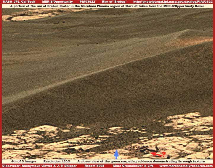 Nos, ennyi talán már túl sok is a történet hátteréhez. Mindezek a trükkök és hamisítások messzemenően alátámasztják a titkos hatalom jelenlétét. Mindez természetesen nagyon érdekes és további elemzést igényelne, azonban most már jó lenne, ha visszatérnénk a képekhez, illetve azokhoz a nyomokhoz, melyeket eltávolítottak róluk. A sorozat negyedik képén 150%-os nagyítást láthatunk a zöld szőnyeg egy részéről, az eredeti felvételből. Vegyük észre, a zöld réteg általában nem homogén, aránylag durva a felépítése, különösen a kék nyíllal jelzett részen, ahol kisebb foltokat láthatunk a lávakőzet repedésein át felbukkanni, ezeken a helyeken figyelhető meg a legjobban. Természetesen még a kellő tapasztalattal nem rendelkező szakember is azonnal felismeri a növénytakaró jellegzetes vonásait. Abban is biztosak lehetünk, hogy ez a fajta durva felépítésű, ám nagyon is egyöntetűen megjelenő „réteg”, amire rápillantunk, távolról sem lehet üledék, vagy kicsiny szikladarabok szőnyege, még akkor sem, ha valakik ezt nagyon szeretnék így beállítani, netán véletlenségből elkövetett színhibák révén a képen látható módon megjelenő „szél által összehordott dűnék”. A piros nyilakkal jelzett három hengeres tárgy által alkotott kis kupac pedig fém- és kifejezetten mesterséges eredetet sejtet.