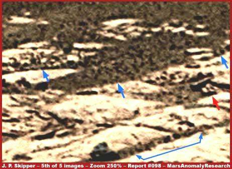 Amint az teljesen tisztán látható a sorban az ötödik, a viszonylag kisebb méretű felvételen, 250%-os nagyítást alkalmazva az eredeti, több részlettel szolgáló TIFF felvételhez képest, mely helyszínen a durvább jellegű üledékes felszínt, helyenként betakarja a burjánzó, és a talajszinten terjedő, itt-ott kisebb kiemelkedéseket produkáló faj; zöld színű, talajszinten élő fajról van szó, ugyanarról, mely jól kihasználja a finomabb üledékes felszín adta körülményeket, azt ugyanis teljes mértékben betakarja, a durvább felszínt pedig igyekszik feltörni, bedolgozni, miközben természetesen szem elöl vesztjük a természetes felszín részleteit. Vegyük észre, habár a felszín jóval töredezettebb, azonban a mélyebben fekvő helyeket már tökéletesen meghódította e faj, ahogy a sziklák repedéseit is, ahol több üledék rakódik le, jó talajul szolgálva a megkapaszkodni igyekvő növényzet számára. Ezeken a helyeken is jól láthatóak a kiemelkedő nyúlványok, elhagyva a sziklák árnyéka nyújtotta biztonságot, szabadon növekszenek. Mindezek a viselkedési megjelenések meglehetősen agresszív faji viselkedést sejtetnek. A kék nyilak a legjellegzetesebb növényi életfoltokra mutatnak, olyanokra, melyek leginkább az előbb említett felfelé növekvő jellemzővel rendelkeznek, míg a piros nyíl három hengeres objektumot jelöl. Az eddig felsoroltak rendkívül erős bizonyítékok a marsi növényi életformák létezése mellett, legszívesebben azon tisztségviselők arcába dobnánk, akik e távoli bolygóról szemrebbenés nélkül terjesztik politikai megrendelésre a hazugságaikat, miszerint a Mars hideg, száraz, poros bolygó, teljesen alkalmatlan bármiféle élet hordozására… Továbbá, ez a közelebbi felvétel egyértelműen világossá teszi számunkra, hogy a korábban látott zöld szín nem „színhiba” következménye, nem a sokkal fényesebb sziklák és a rajtuk lévő üledék „összejátszásának” terméke, nem arról van szó, hogy az apró szemű üledék elnyelné a vörös fényt, de még csak nem is arról, hogy bármiféle képhamisítási eljárás áldozatává estünk volna. Egyszerűen arról van szó, hogy pontosan azt látjuk, aminek látszik amit látunk. Ezt a hihetetlenül erős bizonyítékot, ezt a tiszta és közeli képet, kétséget kizáróan, nem szándékosan hozták nyilvánosságra, sohasem akarták azt leközölni. A hivatalos fénykép már önmaga is igen hatásosan igazolja a lehetséges felszíni élet mellett szóló bizonyítékokat, azonban közel sem annyira, mint ezen a felbontáson. Bármiféle zöld színű, ám távoli nyom, messzi a háttérben, bizonnyal érdekes, de nem meggyőző erejű, és nem esik akkora súllyal a latba, hogy a háttérből irányító titkos szervezeteket lépésre kényszerítené. Biztonságban érezhetik tehát magukat hazugság-váraikban. „A sokat sejtető zöld szín csak technikai hiba eredménye, ennek összekapcsolása bármilyen felszíni növényi életformákkal csak a kutatók valóságtól elrugaszkodott spekulációja.” – mondhatják, illetve mondhatták eddig. A tény ezzel szemben az, hogy a jelen felvétel kellő felbontással rendelkezik ahhoz, hogy 250%-os nagyításban egyértelműen és határozottan kijelenthessük, zöld színű, növényi életformákat látunk, nem pixelési hibát, állításunk pedig valós és megcáfolhatatlan. Forradalmi jelentőségű. Erre a felvételre önmagában még nem tekinthetünk úgy, mint a „végső füstölgő fegyverre”, mivel ezt a címet csak akkor adhatnánk ki a jelen helyszín esetében, ha a teljes környezetre rálátással rendelkezhetnénk, és bepillantást nyerhetnénk a nyilvánosságra soha nem hozott, még jelen fotónál is nagyobb bizonyító erővel rendelkező, hiteles tudományos archívumokba. Az itt látható felvétel rendkívüli jelentőségű, annyira mindenképpen, hogy a hazugság koporsójába néhány szöget beverhessünk általa. Teljesen tisztán érthető, miért kellett olyan nagy hirtelen eltávolítani ezt a fotót és másokat is, hasonló felszíni részleteket ábrázolókat, az archívumokból és csak azokat meghagyni, ahol a nagy távolság és a JPG képtömörítési technika alkalmazása miatt már igen gyengévé válik a felvétel minősége, emiatt pedig lehetetlen alávetni alaposabb, közeli vizsgálatnak. Mindezek fényében az is jobban érthető, miért próbált meg John Skipper mindent elkövetni, hogy a háttérhatalom más kiterjesztésben is mint ahogy a JPL, elérhetővé tegye jelent felvételt, különösen a NASA-tól várnánk ezt, a PhotoJournal oldalon, ahol végül is elérhető egy kicsivel jobb TIFF felvétel. E felvételnek folyamatos elérhetősége a legszkeptikusabb kutatók számára is lehetővé teszi, hogy saját maguk hozzáférjenek és ők maguk ellenőrizzék mindazokat a bizonyítékokat, melyeket itt felvonultattunk. Ha netán mégis eltávolítanák a JPL és a NASA honlapjairól a jelzett felvételeket, ha időlegesen is, az igencsak komoly rosszpont lenne a részükről és ez esetben továbbiakra lehetne számítani. Mélységesen felháborító és gyalázatos az a bevett gyakorlat, hogy ilyesmi egyáltalán előfordulhat a bolygókutatás tudományos adatainak kezelése során, ahol csak bennfentesek végezhetnek igazi kutatást, ahol bizonyos érdekek dönthetik el, hogy az adófizetők milliárdjaiból megépített űrszondák felvételeiből maguk az adófizetők mely felvételekhez juthatnak hozzá egyáltalán, miközben annak érdekében is igyekeznek mindent megtenni, hogy a széles nyilvánosság, magának a helyzetnek a létezéséről se szerezhessen tudomást. Sajnálatos módon pontosan ez a módja annak, amiként a háttérhatalmak működnek és kezelik a nyilvánosságot, az információt és a társadalmi javakat, mindezekre úgy tekintenek, mi