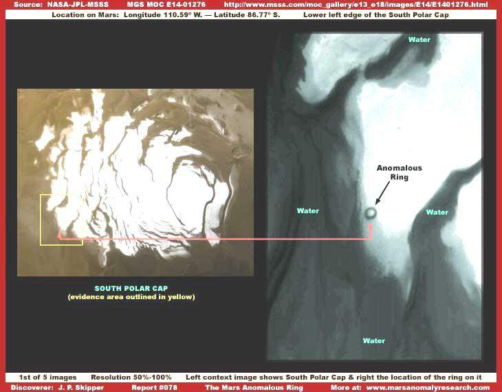 A sorozat első felvételén láthatunk egy hatalmas, tökéletesen szabályos gyűrű alakú formát, egyúttal pontos helyét is a Mars déli jégsapkáján. Ez a rendkívül furcsa jelenség lesz a témája jelen beszámolónknak. Úgy fest, mintha egy pattanásra tekintenénk le valakinek a lábán, teljes mértékben kirí a sarki jégsapka anyagából és környezetéből. Emlékeztetnénk az olvasót, a sarki jégsapka igen nagyterületet foglal el a szárazföldből, ebből kifolyóan tehát a gyűrű alakzat is hihetetlenül nagy. További különlegessége, sehol a Marson nem található hozzá hasonló, legalábbis eddig még soha senki sem bukkant párjára. Először is mindenképpen tisztázni kell, nem becsapódási krátert látunk. Alapvetően tökéletesen kerek objektumról van szó, hatalmas átmérőjű, ám csekély magassági kiterjedésű benyomódás a hatalmas jégsapka fagyott tömegébe. Egy jégfélsziget szélén található, ahol keresztezi a partvonalat, egy hatalmas, nagy mélységekbe nyúló nyíltvizű tenger partvonalát. Erről a tengerről bővebben olvasható a „Vízáradatok a Mars Déli Pólusán” című beszámolóban. Érdemes tudni továbbá azt is, a terület, ahol a gyűrű megtalálható, időnként alámerül a sekély vízben, szezonálisan, amikor az évszakok változásának következtében a vízszint megemelkedik. Ezek a magasabb vízállások bizonnyal elárasztják a gyűrű területének belsejét is, amikor a víz visszahúzódik, akkor pedig az itt lévő része elszigetelődhet és fennmaradhat a szárazabb időszakban is; vize megmarad sötétnek hosszabb időn át is, miként az itt is látható, akár a következő áradási időszak kezdetéig. Valójában az első kép jobb oldalán látható, a környezetett tágabban ábrázoló felvétel 2000. április 27-én készült, a bal oldali pedig 2002. március 18-án, minden bizonnyal magas vízállás közepette mindkét esetben, éppen abban a periódusban, amikor az áradat éppen elönteni készül a gyűrű alakú formát. A gyűrű sötétebb színét valószínűleg, de legalábbis részben a gyűrű területén összegyűlt mélyebb víz fénytörő hatása okozhatja. Továbbá, a sötétebb színt színes szervezetek is okozhatják, miként arról a „Vízáradatok a Mars Déli Pólusán” című beszámolóban is lehet olvasni. Ezek a szervezetek csapdába eshetnek a gyűrű mélyebb területén, amikor a víz visszahúzódik a száraz periódus során, míg a magasabb vízállások alkalmával bizonyára elsodródhatnak. Mivel a szervezetek csapdába esnek a gyűrű mélyedésében a vízzel együtt, a száraz időszakok hosszú hónapjain át, ezért feltételezhető, nagy tömegben találhatunk itt elpusztult szervezeteket, de az is lehet, egyfajta felfüggesztett biológiai állapotban, vagy inaktív módon vészelik át a hideg és száraz időszakot. Tehetetlen testük alámerülhet és összegyűlhet a gyűrű alján, mintegy vastag szőnyeget kialakítva, és a megfigyelhető sötét színárnyalatot produkálva. Ha mindez így van, akkor a melegebb időszak visszatértével a gyűrű területe képes több fényt elnyelni, ezért jobban felmelegedni, mint a sokkal erősebb fényvisszaverő képességű környező jégtömeg, így az is feltételezhető, a gyűrű területén létrejött életközösség más, akár sokkal melegebb általános környezeti feltételek közepette jött létre, s pusztán színének köszönhetően maradt fenn ennyi ideig. Más szavakkal, dinamikus ökológiai folyamatoknak lehetünk szemtanúi, e viszonylag hideg vízzel körülvett térségben, ahol a víz hőfoka önmagában nem elég a kellő hőmennyiség továbbítására és leadására ciklikusan, viszont az évszakok változásával bekövetkező enyhébb periódusokat az itt csapdába esett élettér kitűnően felhasználja és alkalmazkodik előnyeihez. Az eddigiek során rövid áttekintést adtunk a területről, olykor spekulatív elemek hozzáadásával, azonban az eddig felvázoltaknál sokkal több is kiolvasható e különleges, gyűrű alakú területről, mindez az olvasó számára is egyértelmű lesz, ha a továbbiakban közelebbről is szemügyre veszi ezt az érdekes jelenséget.