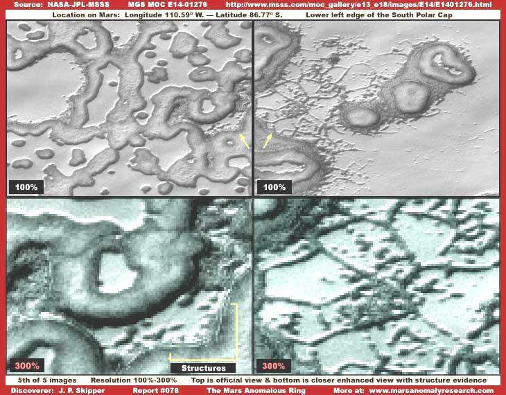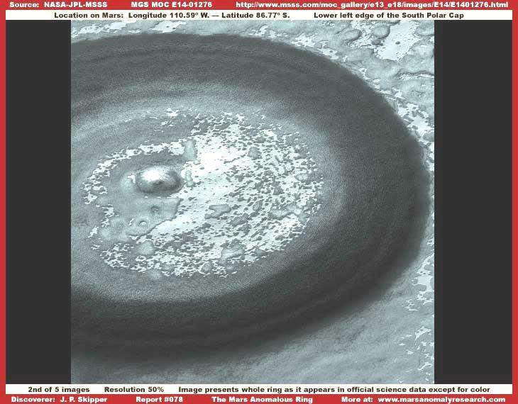 A sorozat második képe ugyan közelebbről láttatja a gyűrű alakzatot, azonban még mindig meglehetősen távolról, viszont a teljes jelenségre rálátást kapunk általa, miként azt a hivatalos források lehetővé teszik. A kiterjedése olyan hatalmas, hogy a keskeny látószögű kamera be sem tudja fogni egyszerre, ezért nem is találhatunk ennél közelebbi keskenylátószögű ábrázolást, melyen a teljes gyűrű látszana. A rendelkezésre álló felvételek mindegyike valamelyik részén levágja a gyűrűt formát. Igaz ez e jelenleg tárgyalt E14-01276 jelű képre is. elmondható még róla, kicsivel jobb felbontású, mint a többi elérhető fotó és ezért kicsivel több vizuális részletet tartalmaz, a távolság azonban továbbra is elég jelentős ahhoz, hogy pontos részleteket láthassunk és meghatározhassuk, mi is ez a terület valójában. Elmondhatjuk még, a sötét, széles gyűrű külső része határozottan befelé lejt, az őt övező felszínt szintjét alapul véve, majd egy ideig nagyjából vízszintesen folytatódik befelé, hogy aztán emelkedő következzen, nagyjából a gyűrűn kívül eső talajszint magasságáig, a gyűrű síkjánál magasabban elterülő központi térségig. Nagy valószínűséggel kijelenthető, hogy a gyűrűn kívüli rész, illetve a gyűrű központi térsége azonos magassági szinten terül el. Alaposabb elemzést olvashatunk a szárazabb periódus alatti állapotról a „Vízáradatok a Mars Déli Pólusán” című beszámolóban, ahol részletesen szó esik valamennyi „térképészeti típusú” képhamisítási eljárásról is a terület kapcsán, a gyűrű térségében alkalmazott elfedési technikák egyértelműen megerősítik, az alakzat meglehetősen sekély mélységbe nyomódik csak be, viszont rendkívül éles körvonalakkal rendelkezik, a körülötte lévő felszín pedig igen nagy valószínűséggel sík és vízszintes. A kisebb, határozottan kör alakú rész a gyűrű központi térségétől kissé balra tolódva, tisztán kivehetően, ugyancsak bemélyedés. Azonban, az e területen alkalmazott képhamisítási technikák következtében, ezzel kapcsolatban nem lehet határozott meggyőződésünk. Ez azt jelenti, a felvétel által nyújtott képi információban, ezen térség kapcsán, nem lehetünk teljes mértékig biztosak. Arra gyanakodhatunk, igen képzett képhamisítási szakértők keltették ezt a bemélyedésre utaló hatást, magasan kiemelkedő formák, szerkezetek akár tömegének elrejtésére is. Mindebben nem lehetünk biztosak. De ha nem ez lett volna a cél, akkor miért kellett „megdolgozni” a felvételt? A következő fontos dolog, amit a második felvétellel kapcsolatban le kell szögeznünk a következő: természetesen szóba sem jöhet, hogy a képen bármiféle ősi becsapódásos krátert látnánk. A sarkvidék térsége – pláne hosszú időt tekintve – dinamikusan változó terület, emiatt ősi becsapódásos kráterek nem maradhattak volna fenn anélkül, hogy szemmel látható változásokon ne estek volna keresztül. Továbbá, a sarkvidék térségében megfigyelhető becsapódásos kráterek közül egyetlen egy sem mutat hasonló vonásokat, mint az itt tárgyalt alakzat. Akár öregebbek, akár fiatalabbak, valamennyien jóval kisebbek, és/vagy fokozatosan csökkenő meredekségű lejtőkkel rendelkeznek, és semmiféle kiemelkedés nem figyelhető meg a központi részeiken. Amit ugye joggal el is várhatunk, hiszen a sarki terület jégből áll, annak összetétele nyilván jóval lazább, mint más területeken a sziklás alapkőzeté. E gyűrű alakzat tehát teljes egészében szokatlan, emellett biztosak lehetünk abban, egészen más folyamat hozta létre. Emiatt teljes mértékben „rendellenes”, a szó mindenféle jelentésének értelmében. Azonban ahogy mind közelebbről és közelebbről vesszük szemügyre, a látvány úgy válik egyre különösebbé, mint ahogy az alább megfigyelhető.
