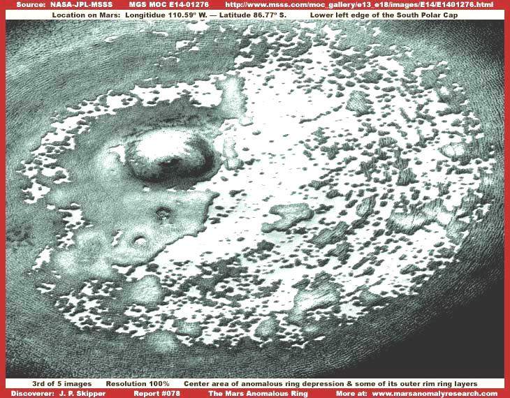 A sorozat harmadik képe kissé közelebbi rálátást biztosít a gyűrű központi területére, a sötétebb részből ezúttal csak kis szeletet láthatunk. A belső része kissé világosabb, részletei is felismerhetők, nem vesznek el a sötétebb árnyalatban, amiként kijjebb. Így sokkal jobban kivehető a finom barázdák/repedések rendszere, a gyűrű külső térségét felépítő szerkezet, igaz, még továbbra is nagy távolságról tekinthetünk le. Valamennyi barázda és/vagy repedés, terasz, teljesen tisztán kivehető geológiai alakzat, egymáshoz való rendezettségük is egyértelmű, valamint az is, hogy a gyűrű középpontjához képes koncentrikus elhelyezkedésűek; továbbá, egyértelműen kiderül, sok-sok réteg építi fel magát a sötétebb területet. Mindenkinek természetesen joga van feltenni a kérdést, mindez miért és hogyan jöhetett létre? Milyen fizikai folyamatok hozhattak létre ilyen elszigetelt, felépítésében ennyire különböző formát, hiszen hasonló sem található nemcsak a Mars Déli Pólusának térségében, azaz közvetlen szomszédságában, hanem az egész bolygón sem. Miként a StarTrekből ismert szereplő, Spock doktor megállapítaná, „lenyűgöző”. De ez nem minden. Vegyük észre, hogy a sötét gyűrű területén megfigyelhető koncentrikus körök folytatódnak a belső térségben is, tökéletesen kivehetők az erős fényvisszaverő foltok közötti sötétebb és sík területeken, egészen a központi részig. Mindez arra a felvetésre enged következtetni, hogy a világos színű részek valamikor a távoli múltban talán maguk is részei voltak a koncentrikus gyűrűk által mutatott barázdált résznek, később azonban lekoptak, elmosódtak, visszahagyva a megfigyelhető, elszigetelődött részeket. Az eredeti alakzat belső vidéke tehát mára már jelentősen feltöredezett. Arra is felhívnám a figyelmet, hogy a legerősebb fényvisszaverő területek ezek körül a szigetek körül mélyebben fekszenek, viszont egy síkban, emellett rendkívül simák, persze már ahol nem szakítják meg folyamatosságukat a láthatóan jól kiemelkedő szigetek. Ez a bizonyos erős fényvisszaverő tulajdonságú felszíni alakzat számít tipikusnak a Déli Sarki jégsapka térségében. Az lenne ugye gyanítható, hogy amit látunk az töredezett ősi jég, illetve a területet időszakosan elöntő víz, illetőleg széndioxid. megfagyása által létrejött képződmény, azonban felmerül a gyanú, sokkal inkább az előbb felsorolt megjelenést utánzó közönséges hamisítással állunk szemben. Skipper igen nagy számban talált hasonló technikák alkalmazását a sarki térségben kutatásai során. Ami viszont szokatlan, az a szigetek teljesen szabálytalan körvonala, habár úgy tűnik, mintha valamiféle partvonalat formáznának a gyűrű belsejében. A gyűrű területére benyúlva viszont az erősen fényvisszaverő területek gyakran mutatnak ovális, illetve kör formát.