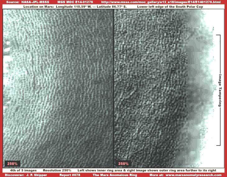 A fent látható ötödik, és egyben a sorozat utolsó képe két terület mutat be a gyűrűn kívül és attól felfelé. A felső két képszeleten, balról és jobbról egyaránt, az eredeti, hivatalosan kiadott változat látható, közvetlen alattuk pedig a nagyított változat. Figyeljük meg a drámai különbséget a felső, a hivatalos verzión, ahol semmiféle különleges dolog nem látható, csak alapformák, részlet alig. Még a szegényesebb felbontás ellenére is (megszokhattuk), csak a közelebbi vizsgálat tisztázhatja, mi is valójában az, amit látunk. Hasonlóképpen, így válhat egyértelművé az is, hogy mekkora távolságból készült a hivatalos fotó, és bepillantást a valódi kapunk a valódi léptékébe. Mindez azért van így, mert a képhamisítási technikák alkalmazása megsemmisíti az eredeti pixelezettséget, mindössze teljesen szabálytalan és szokatlan formákat hagy maga után, ezért semmiféle részletet nem lehet kivenni e területeken a nagyítás fokozásával. Mindez szándékos és mindösszesen csak egy részét teszi ki a képhamisítási eljárások alkalmazásának. A fent látható kép bal oldalán, közelebbi pillantás vethető a kerekded, darabos kinézetű, szigetszerű formákra a fenti részen, míg alatta a nagyított változaton, a geometriai jellegű struktúrákra. Az igazság az, legalábbis a véleményünk szerint, hogy a kerekded, darabos formák valójában képhamisítási beavatkozások, a megfigyelhető illúziót keltve, nyilván azzal a szándékkal, hogy elrejtsenek előlünk valamit. Más szavakkal, éppenséggel az alkalmazott képhamisítási eljárások keltik ezeket a kerekded, darabos formákat, nem pedig valamiféle természetes alakzatok mutatják ezt a képet. Ugyancsak használatos ez a megoldás bizonyos esetekben, amikor vékony sötét árnyékkal rajzolják körbe a kiterjedt, sík területeken előforduló – évszaktól függően -, nyíltvizű, vagy befagyott tavak térségét. További hasonló alkalmazásokat láthatunk, összehasonlítva a jelenlegi, számítógépes program által létrehozott ovális kinézetű formákhoz, kissé kiemelkedő fennsíkok szélén, hamis árnyékhatást keltve, eközben összekapcsolnak és egyúttal kisimítanak geometrikus formákat, viszont a teljes beavatkozás átfogó képét tekintve, hasonlóan kerekded formákat láthatunk. A sík felszín magas fényvisszaverő területébe – feltevésünk szerint – folyékony halmazállapotú (évszaktól függően) felszíni vizeket igyekeztek így lefedni e félig átlátszó megoldással, kombinálva a foltok felvitelét az elmaszatolással. Pontosan azt figyelhetjük itt meg, miként működik a képhamisítási eljárás széles területeken, a sarkvidék szigetein és a vízzel fedett részeken. Más szavakkal, szinte a sarkvidék teljes, jelentős fényvisszaverő-képességgel rendelkező területe nagy körültekintéssel meghamisított, úgy a szigeteknek látszó szárazföldi részek közvetlen beavatkozásoknak köszönhetően mutatják ezt a különleges, formátlan, ovális formát. Aztán az egész felvételt alávetették még a „hamis távolságkeltés” technikájának is, hogy lecsökkentsék a felvétel felbontását. A jobb oldali része az ötödik felvételnek bemutatja számunkra a „hálózat-típusú” látványt, és erősen sugallja számunkra a sarkvidék „jég”-koncepcióját. Amikor először tekintünk a képre a normális, igen távoli benyomást keltő, a hivatalos felbontást mutató felvételre, ezek a formák minden bizonnyal a jég anyagában össze-vissza futó repedések benyomását kelti bennünk, rendkívüli hideg környezetben, s azt is feltételezhetjük, hogy ezek a repedések idővel szélesednek és újabbak keletkeznek. A titkos hatalom tagjai kétségtelenül szeretik ezt a fajta megoldást, hiszen az általuk előre megtervezett irányba viszi a gondolkodást. Azonban jelen kép igen nagy távolságból készült, az alakzatok mérete pedig messze nagyobb annál, hogy a jégben futó repedések lehetnének. Amint az jól látható a meglehetősen elmaszatolt jobb alsó, nagyított és meglehetősen szerény felbontású felvételen, az alakzatoknak eszük ágában sincs olyasféle benyomást kelteni, mintha bármiféle közük is lenne természetes felszíni alakzatokhoz, főként nem a felszíni jéghez, ahogy azt normális esetben elvárnánk a hivatalos felvételen, viszont átalakulnak nagyon is geometriai alakzatokká, ha mégoly furcsa mintázatokba is, de mindenféleképpen mesterséges eredetüket sugallva. Sőt, annál inkább mesterségesnek tűnik, minél több civilizációs nyomot vizsgálunk meg a Marson, mint például a gyűrű térségét. Sajnos a hivatalos felbontás eléggé szegényes lehetőséget ad csupán arról, mi is lehet mindez valójában.