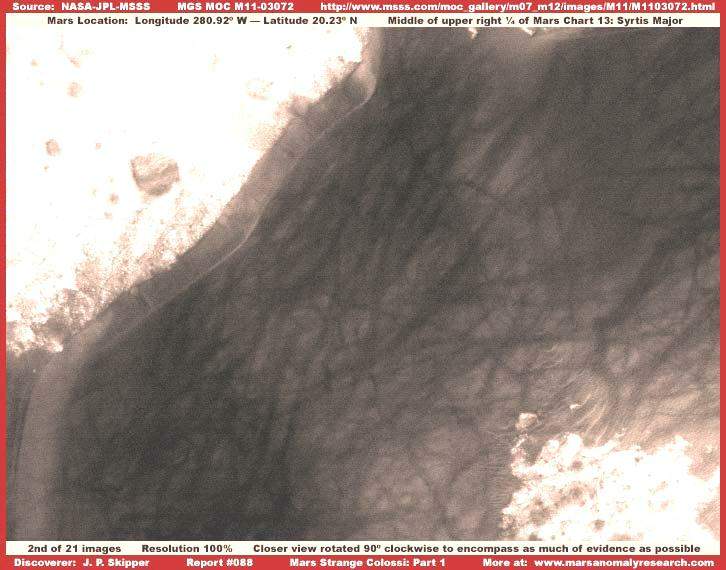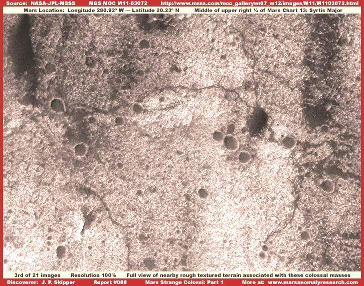 A sorozat harmadik felvételén olyan területet látunk, ahol hasonló jellegű objektumok fordulnak elő csoportosan, méghozzá ugyanabból a fotócsíkból vettük, ahonnan az előző részleteket. A különbség annyi, hogy a felvétel kontrasztosságát kissé megnöveltük, hogy jobban körültekintőbben megvizsgálhassuk a felszíni részleteket. Vegyük szemügyre a viszonylag egyenetlen felszínt és a sötét sávok hiányát. Ez a helyszín rendkívül tipikus a kolosszális alakzatok előfordulásának szempontjából. Felhívnám a figyelmet arra, hogy a sötét foltok térségében a felszínen semmi sem vall arra, hogy bármiféle üledékképződés folyna itt, ezek dűnesorokba rendeződnének az aktuális széljárásnak megfelelően, miként azt a Földön olyan jól ismerjük. Más szavakkal, valamennyi sötét objektum egyfajta sziget benyomását kelti, a környező felszíni képződményekkel semmiféle kapcsolatot nem mutat, a legkisebb jelét sem látjuk annak, mintha a környező felszín anyagából épültek volna, épülnének fel; semmiféle nyomát nem látjuk e kiemelkedő objektumokon a széleróziónak sem. Példának okáért, ha a környéken lett volna olyan erős szél, hogy kialakítsa ezeket a formákat és kitisztítsa és elfújja az összes szemcsés anyagot a környező területekről, akkor hol vannak ennek egyértelmű nyomai, hol vannak az összegyűlt üledékhalmok a tekintélyes méretű kiemelkedő objektumok szélárnyékos oldalán, amelyeknek szintén egyértelműen meg kellene mutatkozniuk itt, nemde? Nem lehet egyszerre „megenni a tortát és megtartani a tortát”. Ezeknek a szélárnyékban lévő üledékhalmoknak a hiánya pontosan ugyanúgy megfigyelhető jelen esetben, mint az összes hasonlóban. A kérdés az, a világtudósai miként bélyegezhetik ezeket az objektumokat „szélfútta dűnéknek”, amikor ők is pontosan ugyanúgy nem látják a széljárás eredményének semmiféle nyomát, ahogyan mi sem, semmiféle üledéknek még a nyomát sem, amit a szél egyáltalán felkavarhatott volna, mindenféle megfigyelhető vonás ellentmond a „szélfútta” elméletnek, ám a tagadás fala mögé bújva mindezek az ellenérvek ugye már meg sem hallhatók. Akárhogy is, a legfontosabb dolog, amit szeretnénk az olvasó számára tudatosítani e harmadik felvétel segítségével az az, hogy a fotócsíkon jelenlévő objektumok igen nagy mérete ellenére, az igazság az, hogy valójában még annál is sokkal messzebb vannak, mint amit a statisztikai adatokból kikövetkeztethetnénk. A képen megfigyelhető, keskeny, sötét vonalhálózat minden bizonnyal folyók által lekoptatott völgyek nyomai. Továbbá, habár meglehetősen nagy a távolság ahhoz, hogy normálisan megvizsgálhassunk egyedi objektumokat a sorozat harmadik felvételén, a file mérete, ennek az egyetlen felvételnek az esetében, abnormálisan nagy. Mint ahogy sok-sok felvétel alapos tanulmányozása jelzi, mindez annak eredmények, hogy a képhamisító számítógépes program igen nagyszámú apró objektumot helyezett el a képen. Jelen estben mindez azt jelezheti, hogy számos egyedi geológiai formát helyeztek el a felvételen a széles látószög és a nagy távolság érzékeltetésére, de valami másra is utalhat. A mégis megfigyelhető felszíni alakzatok bepillantást segítenek nyújtani abba, valójában milyen nagy távolságból tekinthetünk a térségre. Mindez igen tipikus jelen megnyilvánulási formák esetében, és része az elrejtésükre szánt törekvéseknek. Ezek az ismeretek ahhoz is hozzásegítenek bennünket, hogy felismerjük, a hivatalos adatok nemcsak a távolság és arányok szempontjából megbízhatatlanok, de emellett ezek a sötét objektumok habár így is hatalmasoknak tűnnek, a valóságban még annál is sokkal nagyobbak, mint amiként az eredetileg feltételeztük. Valójában nem tudjuk megmondani azt, miként manipuláltak jelen esetben a távolsággal, nem sikerült rábukkanni semmiféle viszonyítási pont a bemutatott képrészlet kapcsán, azonban feltehető, akár teljes városok is elférnének egyetlen sötét objektum alatt, így talán fogalmat alkothatunk valós méreteiről.