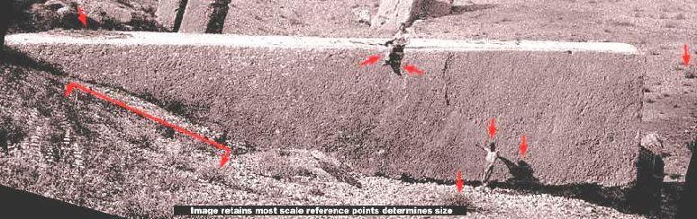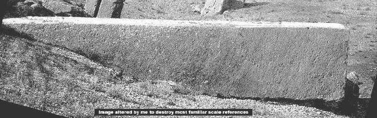 Ez az ősi sziklatömb a leghatalmasabb ismert, egy darabban megmunkált kődarab a Földön. Méretei 23 x 5.33 x 4.33 méter, a súlya pedig valami hihetetlen, 1170 tonna. Egyike a híres Baalbek-i kolosszális köveknek, ez az egy azonban továbbra is kapcsolódik ahhoz a sziklafalhoz egyik végével, ahonnan kifaragták; otthagyták egy közeli kőbányában és sohasem használták fel. Baalbek Libanonban található, pontosabban a Bekaa völgyben a libanoni hegyek között, körülbelül 60 km-re a Földközi-tengertől a 34. szélességi és a 36. hosszúsági körön. Az ősi időkben Baalbek viszonylag kicsiny bányászfalu volt a Damaszkusz felé vezető út mentén. Sokkal később a rómaiak jöttek és felépítették szinte a leggondosabban megmunkált templomaikat az ősi helyszíntől nem messze, felhasználva ezeket a gigászi faragot köveket alapként és támfalakként. Azonban hogy eredetileg ki volt képes ezeket a kolosszális faragott köveket egyáltalán megmozdítani, messze a római kor előtt – továbbra is rejtély. Ha valaki bővebben szeretne olvasni Baalbek köveiről, az alábbi Internetcímet keresheti fel, egyben bepillantást kaphat az ősi rejtélybe. http://www.geocities.com/jirimruzek/baalbek.htm?200516 Amit itt igyekszünk bemutatni az nem más, mint annak illusztrálása, miként lehet egész egyszerű trükkökkel elrejteni egy objektum valós méretét, az igazán tökéletes megoldás érdekében persze meg kell változtatni a környezet bizonyos elemeit is, ahol nyugszik. Még fontosabb, hogy a mesterségesen létrehozott változások valamiképpen hasonlatosak legyenek a Földön megszokott környezeti viszonyokhoz, hiszen ezeket szokta meg az emberi szem, erre determinált. A két férfi és az általuk vetett árnyékok, a fentebb látható kőfejtőben, közvetlen mellettük a kőtömbbel, nagyon könnyen meghatározható méretviszonyokat ad, mindehhez hozzájárulnak az ismerős felszíni formák, a természetes környezet. Mindezek egybevetésével igen pontos méreteket tudunk megadni a gigantikus kőtömb vonatkozásában. A jól felismerhető bokrok és növényzet további segítséget nyújt mindehhez. Ennél a pontnál szeretnénk rámutatni arra, hogy a képek hamisításának egyik célja éppen a távolsággal való manipulálás, minden olyan részlet eltávolítása az adott felvételről, ami bármiféle viszonyítási pontként szolgálhatna az adott részlet méretét illetően, így természetesen kisebb az esély a rendellenes objektumok felismerésére is. A viszonyítási pontok hiányában rendkívül nehéz meghatározni a felvételeken látható különleges objektumok pontos méretét. Ez lehetővé teszi azok számára, akik ily módon manipulálják a felvételeket, hogy elrejtsék az információkat pusztán a látvány megváltoztatása által, mint ahogy jelen beszámoló első részében is láthattuk, a viszonyítási pontok összezavarása révén jóval sikeresebben tudják elérni, hogy azt lássuk a képeken, amit láttatni szeretnének velünk és nem azt, amit valójában ábrázol. Az első részben bemutatott kolosszális formákat, az MGS MOC M11- és az SP1-23008 keskeny-látószögű felvételeken szükségtelen volt elrejteni, hiszen a viszonyítási pontok hiánya jelen esetben bőven elegendő volt a helyes értelmezhetőség összezavarására. Azonban ezek a hatalmas objektumok kellőképpen kiterjedtek ahhoz, hogy a sokkal nagyobb területet ábrázoló, nagylátószögű MOC felvételeken is láthatóak maradjanak; érdemes e tekintetben összevetni a kis látószöggel és a széles látószöggel készült felvételeket. Informatív megállapításokat tehetünk. Mindenekelőtt azt, hogy az igazán rendkívüli objektumokat általában a kis látószög alatt készült felvételeken igyekeznek további képhamisítási technikák alkalmazása révén eltüntetni, de a nagyméretű objektumok esetében ezt már a nagylátószögű felvételek esetén is olykor megteszik. Érdemes összehasonlítani az M11-03073 és az R07-01469 kislátószögű felvételeket. Mi is felismerhetjük, lekicsinyítve – látszólag – az igazán kiterjedt objektumok méretét, és ezzel elfedve valódi természetüket, azok igazi természete szinte felismerhetetlenné válik.