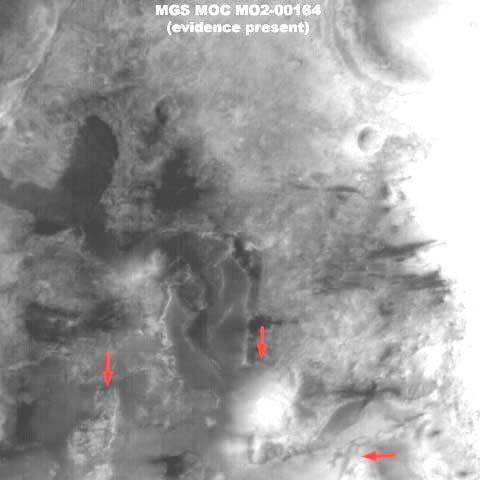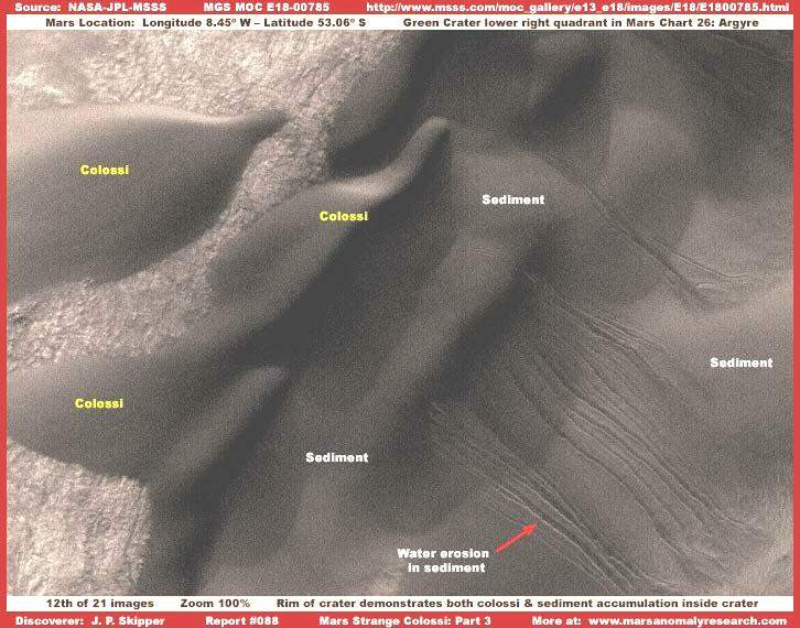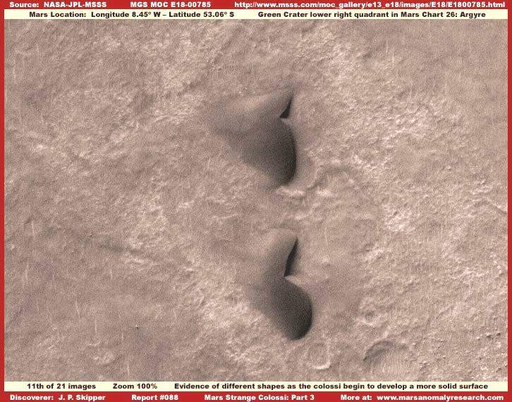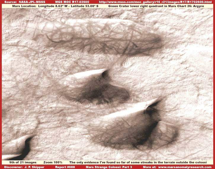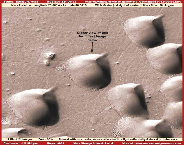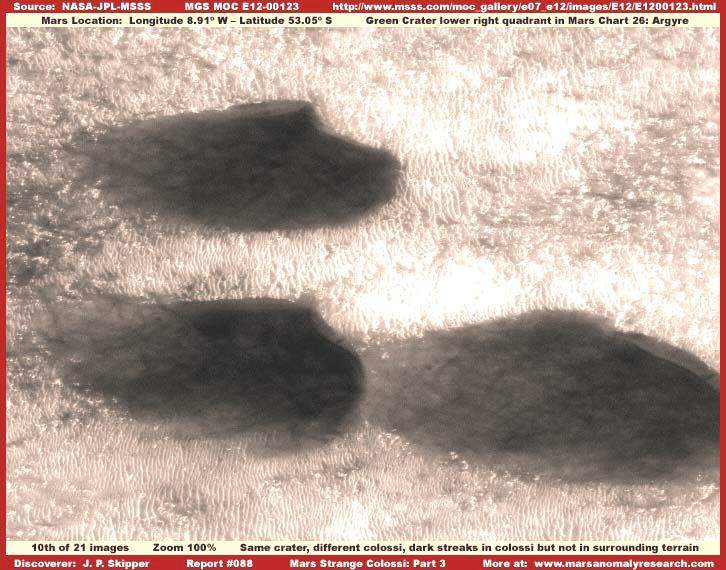 Az igazsághoz hozzátartozik és éppen ezért mellékeljük a fenti, R17-02600 jelű, 2004-ben készült felvételt, mivel ez éppenséggel azt demonstrálja, hogy a sötét sávok előfordulhatnak a kolosszális objektumok közvetlen szomszédságában is. A felvétel a Mars déli vidékéről való a Zöld Kráter térségéből az Argyre régióban. Továbbá, felhívnám a figyelmet arra, hogy a sötét sávok egy része egybeesik a kolosszális objektumok külső körvonalaival. Habár meglehetősen kevés képi információval szolgál, elérhető egy további, szintén 2004-ben készült felvétel, hasonló jellegű formákat ábrázolva, archiválási száma: R13-02693. Persze igen fontos leszögezni, a kolosszális objektumok között lévő sötét sávok felbukkanása nem tipikus jelenség, és amint az tisztán látható itt, a kiemelkedő objektumok felszínén húzódó sötét sávok száma messze több, mint a köztes területeken megjelenőké, az esetek nagy részében pedig nincs is közöttük folytonossági kapcsolat. Azt is megjegyezzük itt, hogy a legfelső objektumtól eltekintve, a két alatta elhelyezkedő formában közös a magasan kiemelkedő jobb oldal és a hosszú lejtős baloldal. Szintén figyelemreméltó közös vonás a tompaszögű bevágódás a két objektum jobb oldalán, miként a kisebb lapos rész a jobb oldalukon. Egyfajta „belépő él” képet fest, legalábbis földi terminológiával leírva. Számos más esetben, a különböző fotócsíkokon, pontosan ugyanezt a megjelenést tapasztalhatjuk, és még az irányítottságuk is azonos. Az irányultságukban meglévő közös vonás vezetett a hivatalos forrásokban „dűne”, illetőleg „homokdűne” meghatározáshoz, hivatkozva az uralkodó erős széljárás fokozott talajformáló tevékenységére, mint közös tényezőre az objektumok létrejöttében. Megjegyzendő továbbá az is, hogy a fenti objektumok szigetként emelkednek ki a környező térségből. Fontos észrevenni, a környező felszínt borító talaj megjelenése a legkisebb mértékben sem utal annak üledékes mivoltára. Ha feltételezzük az erős, uralkodó széljárást, akkor egy ilyen jellegű szél mindenféle üledéket elhord a környékről és nem halmozza fel azt (homok) dűnék formájában, nem formáz ilyen képződményeket, hiszen ereje elegendő ahhoz, hogy éppenséggel széthordja azokat, főleg azért, mert jelentősen kiemelkednek a talajszintből, így nyilvánvalóan sokkal nagyobb mértékben ki vannak téve a szél hatásának. Normális körülmények között éppenséggel azt várnánk, hogy üledékből felhalmozott dűnék éppenséggel szélárnyékban jönnek létre, a képen látható objektumok jobb oldalán, azaz a homorú oldalukon. Semmiféle ilyen nyomot nem látunk a felvételen. Mindez azért van, mert bármi is volt az eredetük, ezek az objektumok mostanra már szilárdak, kellőképpen ellenállnak a Mars természeti és geológiai hatásainak, ahogy a szélnek is. Más szavakkal, akármik is legyenek ezek, nem lehetnek távolról összehordott talajszemcsék szél által feltornyozott dombjai, vagyis semmiféleképpen nem tekinthetők „dűnéknek”, vagy hasonlóknak. Nem számít, miként néznek ki, mire emlékeztetnek erős fényvisszaverő felületük és formájuk miatt; ezen a kolosszális objektumok valós természetének pontos megértéséhez másféle gondolkozás szükséges, olyan, mely kívül esik a hagyományos sémákon.