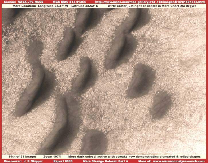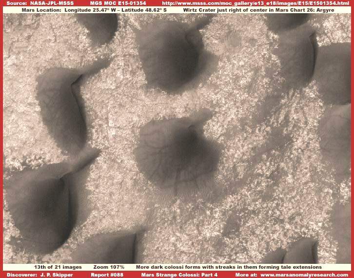 A sorozat fenti, 13. képe a MOC E15-01354 jelű képcsíkból való, a már ismert kolosszális objektumok további megjelenési formáit mutatja. Ismét egy kráter belsejében vagyunk, ezúttal a Writz Kráterben, mintegy féltucat kilométerrel nyugatra, ugyancsak az Argyre régió középső területén, mint ahol a Zöld Kráter is megtalálható. A fenti képrészlet csak töredékét mutatja be egy kiterjedt, hasonló formákkal zsúfolt területnek. Ismételten megjegyezzük, a kolosszális objektumok sötétek és fényelnyelőek, némi átlátszóságot is mutatnak, bizonyos határok között, ismét feltűnnek a sötét sávok, szigorúan a kolosszális objektumok területére korlátozódva, semmiféle jele nincs a köztes területeken megjelenésüknek. Azonban vegyük észre a fenti kolosszális objektumok mintegy farkat növesztenek háti oldalukon, jobb oldalukon, felül figyelhető meg. Habár meglehetősen szokatlan az alakjuk, nagyon jó bizonyítékkal szolgálnak a jelen beszámolóban megfogalmazott állítások alátámasztására. Azt is vegyük észre, hogy a fenti képen látható hatalmas objektumok meglehetősen egyöntetűen, jól kiemelkedő kúp alakot formáznak, legmagasabb pontjuk az objektumok középpontja felé tendál, sokkal inkább, mint valamelyik széle irányába, ahogy azt korábban megfigyelhettük. Más szavakkal, valami – a korábbiaktól eltérő – történés folyhat jelen kolosszális objektumok esetében, alátámasztva dinamikus és változásra képes tulajdonságaikat és azt is, hogy semmiféleképpen nem állhatnak üledékes anyagból, nem lehetnek szélfútta „dűnék”, annál sokkal többek.