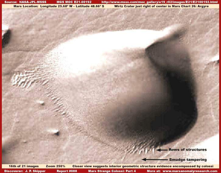 Az E15-01354 fotócsík, ahonnan a 13. és a 14. számú képrészlet való, 2002 áprilisában készült. A fenti, 15. felvétel és a 16. – ezek az R21-00192 fotócsíkról valók -, viszont 2002. októberében, nagyjából hat hónappal később. Mindkettő ugyanazt a területet ábrázolja, a Wirtz Kráter keleti vidékét; a képen láthatóak pedig nagy valószínűséggel ugyanazok az objektumok, mint a 13. és 14. felvételen megfigyelhetők. Mint ahogy jól látható, ez utóbbi felvétel sokkal tisztább és élesebb, mint a 13. és 14. képen bemutatott részlet. Azonban mindez csak illúzió. Onnan fakad, hogy az újabban készült képen az objektumok sokkal szilárdabb, határozottabb fényvisszaverő felszínnel rendelkeznek, pontos és jól meghatározható körvonallal, éles árnyékokkal, ezúttal az objektumok felületén is. Véleményünk szerint mindez abból fakad, hogy a környező felszín, de maguknak az objektumoknak a jobb oldala is, képhamisítási eljáráson esett át, ezúttal a pacázási technikát alkalmazták. Igen körültekintően jártak el, a felvétel jóval nagyobb felbontású változatán hajtották végre, mint ami itt látható, aztán az egészet lekicsinyítették, mesterségesen megnövelték a rálátás távolságát, természetesen azért, hogy az eljárásukat álcázzák, a „gyanús” alakzatokat elrejtsék. A térkép-típusú technika révén sikerült aránylag jól elfedni, az eredeti felvételen sokkal élesebben látható lefolyási rendszert, a további hamisítási technikákkal az egész felszín általános textúráját megváltoztatták, ennek köszönhetően, az eredeti felszíni formák szinte tökéletesen rejtve maradnak. Ennek tudható be, hogy a 15. felvételen a felszín miért látszik ennyire másnak, mint a 13. és 14. felvételeken. De még csak azt sem mondhatjuk, hogy a 13. és a 14. képen látható lenne az eredeti felszín. Ha így gondolnánk, bizonyára hibát követnénk el. A kolosszális objektumok felszínét sem kímélték a hamisítással. Sőt, a képhamisítás révén ezen objektumok jellege még inkább szembetűnővé vált, ahelyett, hogy elrejtette volna azokat. Már a formájuk is különleges, az automatikusan futó számítógépes program pedig bizonyára nem úgy volt megszerkesztve, hogy ilyen kiterjedt és különleges formákat is kezelni tudjon. Összegezve tehát: a talaj felszíne bizonnyal nem valós, ahogy a kolosszális objektumoké sem, azonban ez utóbbiak alakja nagyjából megfelel a valóságnak. Emellett úgy tűnik, további fejlődési állomását képezik a 13. és 14. képrészleten bemutatott sötét, fényáteresztő tulajdonsággal rendelkező, sötét sávokat tartalmazó formáknak.