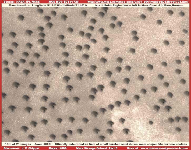 A fenti, E01-01728 archívumszámú felvétel részletén igen nagy számú egyedi objektumot láthatunk, melyeket természetesen a hivatalos források továbbra is szerencsekeksz formájú homokbuckáknak kategorizálnak. Bővebben, itt található leírás: http://www.msss.com/mars_images/moc/2003/07/25 Azonban vegyük észre, valamennyi egyedi objektum olyaténképpen fest, mintha különálló szigetekként emelkednének ki a felszínből, semmiféle nyoma nincs üledéknek a közöttük lévő területen. Abban az esetben, ha a szél tornyozza fel a dűnéket, nem vagdossa le egyik szélüket szinte tökéletes egyformasággal. Továbbá, ezek az objektumok igen nagy távolságról láthatók, ezért sokkal nagyobbak, mint amekkoráknak innen tűnnek. A fentebb közölt képcsíkon a közölt részlet alatt és felett jelentős méretű, vastag objektumok láthatók, talán megkeményedett üledékes képződmények. Mindez azonban nem változtat azon a tényen, hogy ezen a képrészleten semmiféle laza üledékes nyomokat nem látunk sem az objektumok közötti részen, sem azokhoz kapcsolódva. Arra gondolhatunk teljes joggal, ezek az objektumok nem homokdűnék, hanem dinamikus, alakjukat változtató objektumok, melyek igyekeznek felvenni a homokdűnék alakját.