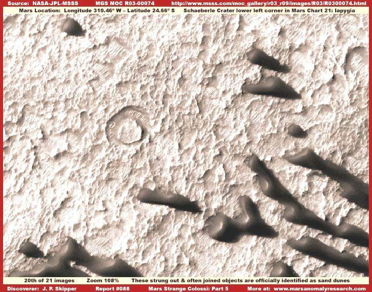 Jelen beszámoló utolsó részében néhány további példát szeretnénk bemutatni a Mars kolosszális objektumaira, melyeket a hivatalos álláspont szerint továbbra is homokdűnéknek kellene beazonosítanunk, azonban inkább tűnnek másnak természetüket illetően. Sajnos nincs rá lehetőség teljes körültekintéssel megvizsgálni őket, ez esetben ugyanis fényképek tucatjait kellene felsorakoztatni, inkább csak az olykor megfigyelhető árnyalatnyi, illetve drámai különbségekre szeretnénk felhívni a figyelmet. Az olvasóra marad a döntés, mit gondol természetükre vonatkozóan.