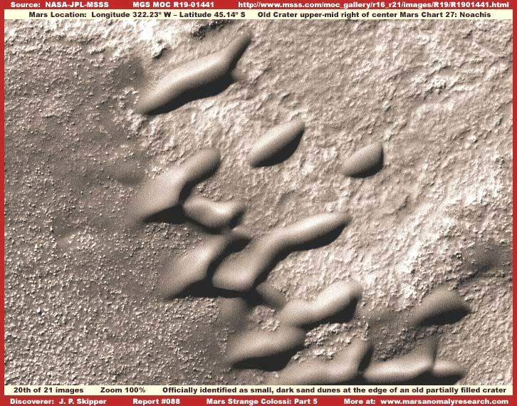 A fent látható 20. felvétel az R19-01441 archiválási számú fotócsík részletét ábrázolja; elnyúlt kerekded formák tucatját látjuk, a már ismert sötét homokdűnék kategóriába sorolva. Bővebben: http://www.msss.com/mars_images/moc/2004/11/08 Úgy néznek ki, mintha homokdűnék lennének? Valójában olybá festenek, mintha valami hatalmas lárvatelepet látnánk ennek részben kitöltött idős kráter szélén. Természetesen valójában nem erről van szó, de abban is biztosak lehetünk: nem természetes eredetű homokdűnékkel van dolgunk. Úgy gondoljuk, ezek az objektumról valamiféle életet jeleníthetnek meg, a kérdés az, hogy milyent? Szerintünk, ezek a formák valamiképpen kapcsolatban lehetnek a „Mars alagútjai” című fejezetben leírt objektumokkal. Mintha valamiféle közös fejlődési alappal rendelkeznének, és ez hozza kapcsolatba őket. Ha ezek az objektumok életet jeleznek és/vagy igen fejlett technológiát, mindkét kérdést jogosan tehetjük fel, azonban egyiket sem tudjuk meggyőző módon megválaszolni, pusztán a látvány alapján. Messze túlmutat az itt látható objektumok természete a közönséges homokdűnéknél, amiatt rejtélyesnek tűnnek, bármiféle felvetést velük kapcsolatban nehéz objektívan és alaposan ellenőrizni, és természetesen most is szükségünk van a sémamentes gondolkodási képességre.