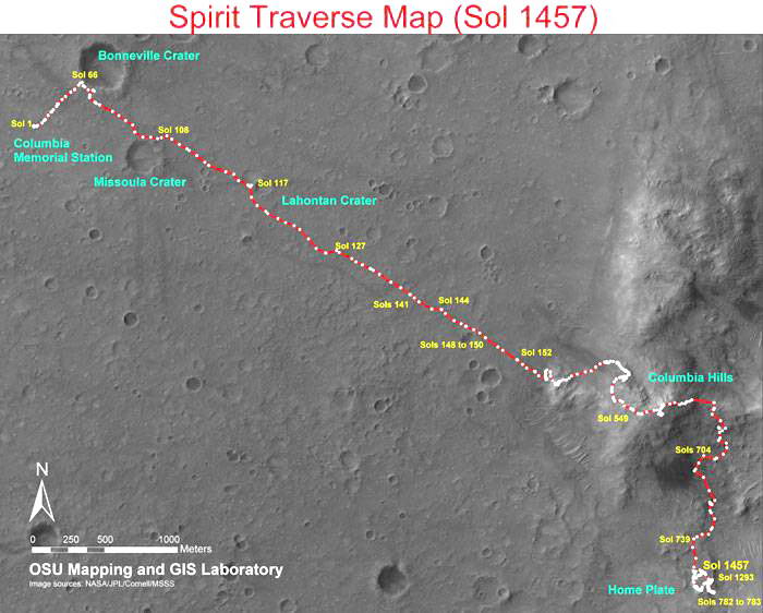 Külön szembetűnő, hogy a Spirit nem egészen fél év alatt elérte a Columbia Hillst, majd annak területén tartózkodott több, mint másfél évig, hogy aztán a Home Plate-re és környékére menjen tovább, ahol azóta is van, több, mint két éve!