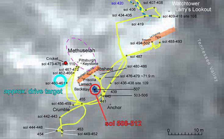 A képelemzések után érthetővé vált, miért ment a Bonneville kráterhez. Az is kiderül, hogy a Columbia Hills-ben keresett valamit a Sol 420 és a Sol 510 marsi napok közt. A mozgása az alábbi volt: