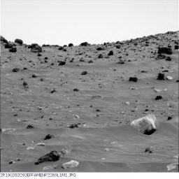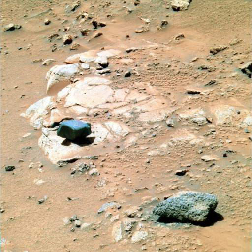Ennek a látszólag kesze-kusza mozgásnak semmi köze tudományos kutatáshoz, egészen nyilvánvaló, hogy Spirittel kerestek valamit. Hogy mit, lehet, sosem tudjuk meg. Érdekességképpen azért ideteszem egy különös formájú, nagyon szép kékes színű kőnek a képét, amelyről sok felvételt készített a Spirit, mind a pancam, mind a navcam több képén látható. Érdekesség még az is, hogy ehhez hasonló formájú kő még van a környéken.
