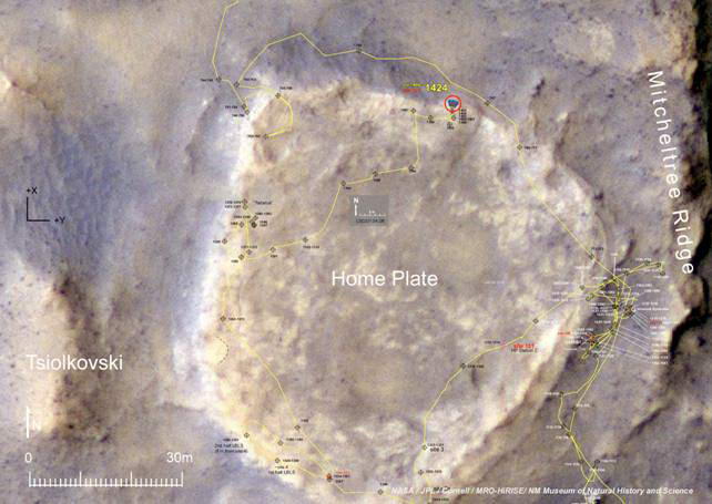 Tessék elolvasni a szaggatott vonal melletti feliratot:"corridor of interest". Csak így, katonásan. Semmi finomkodás, semmi "area", semmi "to be explored" vagy "research". Egyszerűen kijelöltek egy folyosót, amelyen belül érdeklik őket a Mars felszínén látható dolgok. Nem kell túl nagy fantázia ahhoz, hogy mi miatt érdekelheti őket egy ilyen területsáv: valamit meg akarnak nézni, ami egyenes vonalú mozgással érte el a felszínt. A "folyosó" vége a Home Plate-nél van! Aztán itt a Home Plate körüli mozgás: