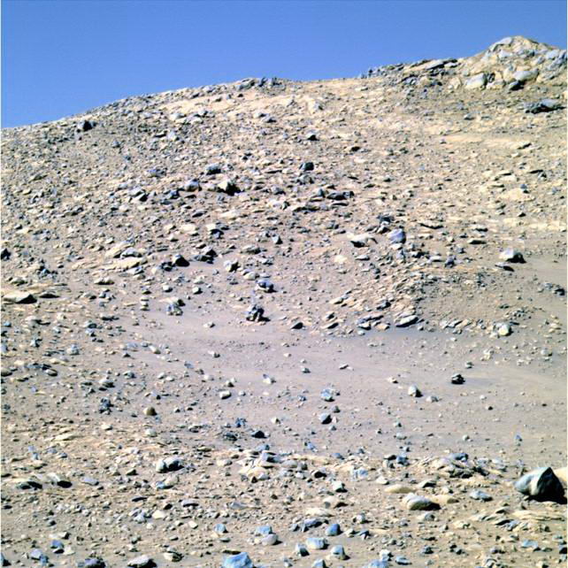 Ahol a Spirit felvételei készültek, igencsak más a helyzet. Az égbolt fényes. Sokkal fényesebb, mint a felszín, csak igen fehér (világos) sziklás felület esetén lesz kissé sötétebb. Ez azt jelenti, hogy ahol a Spirit képei készültek, ott teljesen tiszta, derült égbolt esetén az ég színe kék. Ez bizonyos por vagy pára "szennyeződés" esetén akár fehéres, világoskék is lehet. Ezt mutatja be az alábbi színes felvétel, ami a Columbia Hills-en készült, minden szűrőt használt a Spirit. Ezekből készítettem el a színes képhez szükséges RGB rétegképeket oly módon, hogy ahol lehetett, 3 szűrő felvételét használtam az alapszín kialakításához, és a színillesztést a színtárcsa 4 színére és 3 szürkeárnyalatára végeztem el kb. 5% pontossággal. (Természetesen színárnyalat hibák vannak)