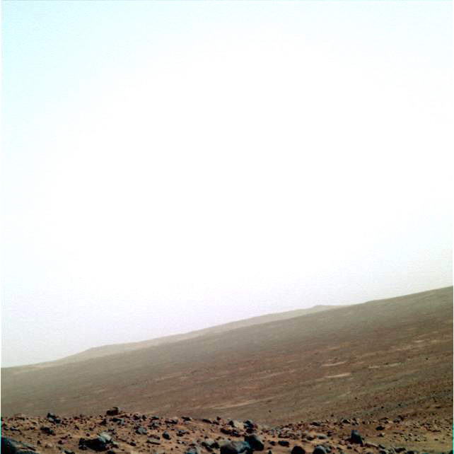 Érdekességképpen mutatnék egy szűrőzés nélküli felvételt. Azt tudni kell, hogy a marsroverek CCD-je 760 nm hullámhosszú fényre a legérzékenyebb, és a hullámhossz csökkenésével egyre kevésbé érzékeny: a 760 nm-e vörös fényre mintegy 6-szorta érzékenyebb, mint a 430 nm-es kék fényre. Ezért is érdekes látni, hogy a szűrő nélkül készített képen is az égbolt kb. 1EV-vel fényesebb, mint a felszín. Helyes színes képen ezért lesz kb. 2 EV-vel fényesebb.