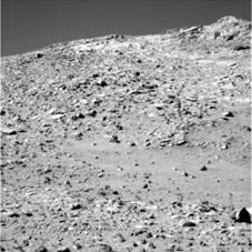 A domb gerincéig éles a kép, azon túl elmosódott Megfelelő nagyítással mutatkozik a terület kijelölési vonal helye. A navcam mélységélessége 0.5m-től a végtelenig tart, így a távolabb levő síkságot is élesen kellene látni a felvételen, ha nem manipulálták volna egy megfelelő "elmosás" funkcióval. Miért tehették?