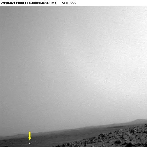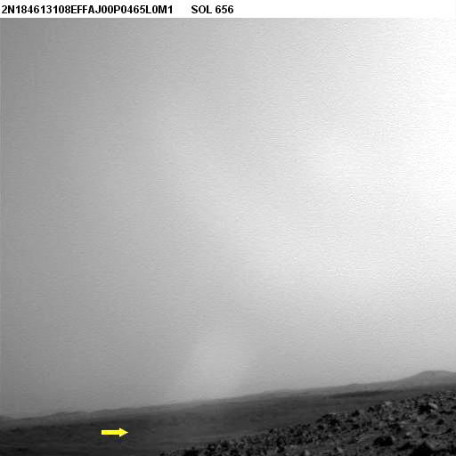 A balkamera képén egy fénypászta látható, amely megvilágítja egy helyen a felszínt (sárga nyíllal jelölve). A felszínen megvilágított terület átmérője a sztereo képpár parallaxis eltérése alapján 8-9 m. Elég kicsi. Figyelemre méltó, hogy a fénypászma kissé széttart! Fénypászmát csak úgy nem látunk. Ahhoz vagy az kell, hogy az égbolt felhős legyen, és egy kis résen átvetüljön a napfény, vagy egy mesterséges fényforrás szükséges (no, és persze poros vagy párás levegő). Sem a felhős égbolt, sem a mesterséges fényforrás nem illik bele a "hivatalos" Mars képbe.