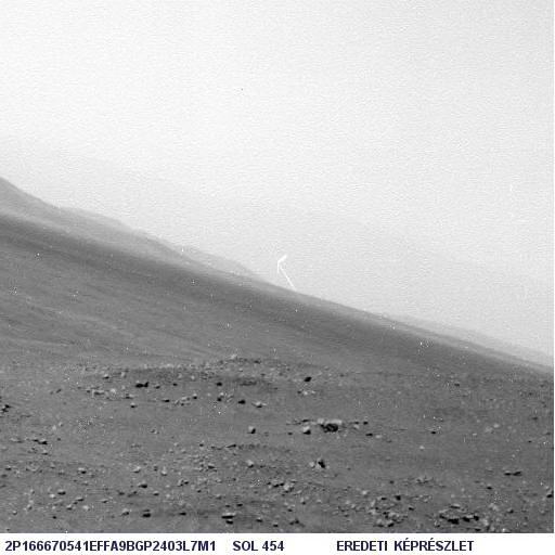 Még mielőtt elkezdenénk vizsgálni, mi látható a felszínen, egy történelmi jelentőségű Spirit felvételt mutatok be. Ez, azt hiszem, csattanós választ adhat az előző részben felvetett kérdésre, hogy mik azok az égen látható fényes foltok, meg hogy honnan származhat az egyik képen látható fénypászta.