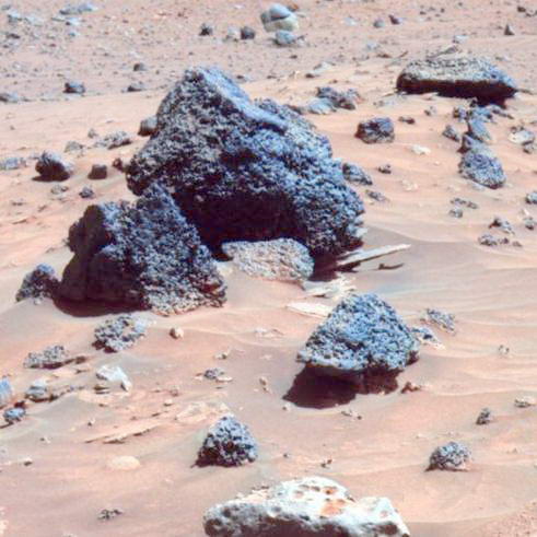 Mindjárt két idézőjeles szó is! A következőkben kiderül, hogy miért. Az a helyzet ugyanis, hogy a Spirit a Columbia Hills-ről leereszkedtében fekete szivacsos alakzatokra bukkant. Ezek aztán nagyjából a Home Plate-ig kísérik útját, hol több, hol kevesebb látható, de a Home Plate-en és környékén is akad bőven. A NASA a sajtónak szóló képes tudósításokban meg is említi őket. Álljon az alább két példa. Az egyik:
