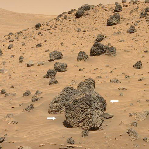 Itt valami vagy valaki nagyon szénné égett a Columbia Hills oldalában. A környezetében sehol sincs ilyen fekete alakzat, csupa fehér és világos kőzet látható. A sárga nyilakkal jelölve eléggé felismerhető két végtag, amely ujjakkal kapaszkodik a kiálló kőbe.