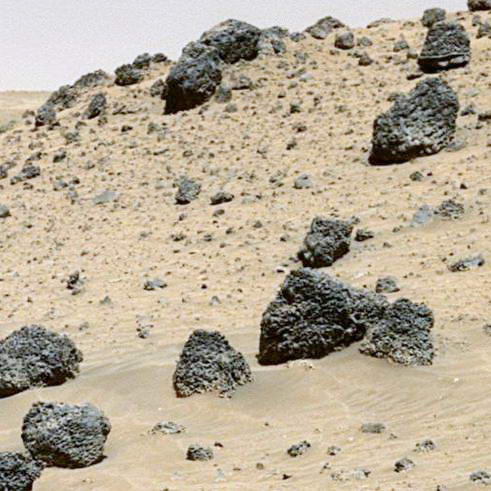 Szóval nem igazán stimmel a látvány és a magyarázó szöveg. Elég "rejtélyesnek" tűnnek vulkanikus kövek a homokon... Éppen ezért a kereső elméjű emberben rögtön felmerül valami homályos gyanú. Vulkanikus kövek? Lávafolyás? Vulkán? ... Akárhogy nézzük a Spirit képtárát, akárhogy keressük, SEHOL NINCS LÁVAFOLYÁSRA UTALÓ KÉP. EGYETLEN KÉPEN SEM LÁTHATÓ ANDEZIT VAGY BAZALT KŐZET, ami azért a lávaömlés velejárója (legalábbis a Földön). Ha megvizsgáljuk tüzetesen az Mars Orbital Camera (MOC), vagy az MRO idevágó felvételeit, valamint tüzetesen átvizsgáljuk a Spirit képtárát, egy "apró" problémára akadunk a fenti magyarázatokat illetően: NINCS ÉS NEM IS VOLT VULKÁN A KÖRNYÉKEN! Arról persze még nem is tettünk említést, hogy ha ezek a fekete likacsos "kövek" vulkáni eredetűek lennének, akkor eléggé frissnek kellene lenniük, nem pedig évmilliós korúaknak, hiszen a finom likacsos szerkezetük nem maradhatott volna fenn ilyen sok ideig. Azt is megemlíthetnénk, hogy ha az előbbi képhez tartozó magyarázatban említett felszínű "kő" valóban egy lávafolyás felszíni megkeményedett táblájának töredéke lenne, akkor azért látni kellene lávafolyást is valahol, hiszen a lávafolyás megkeményedett felszíni táblái nem kerülnek nagyon messze a folyástól. De nincs lávafolyás.... KÖVET LÁTUNK EGYÁLTALÁN?