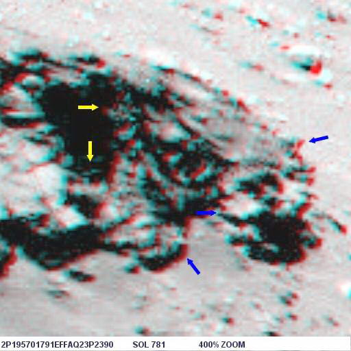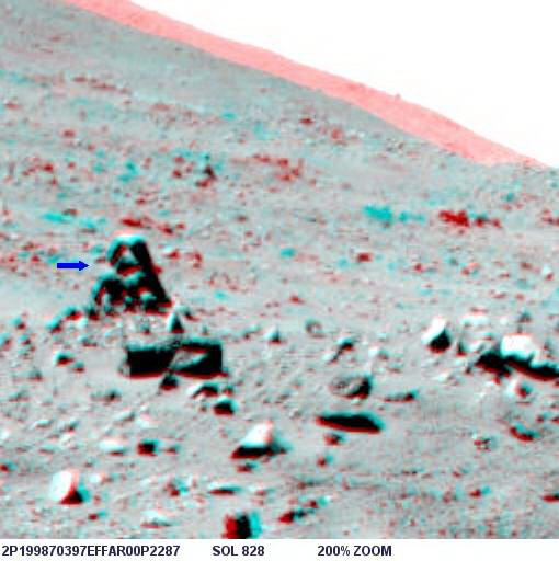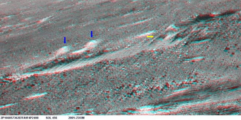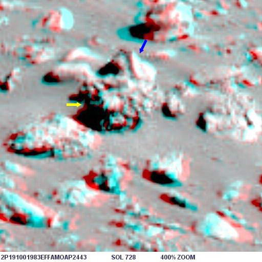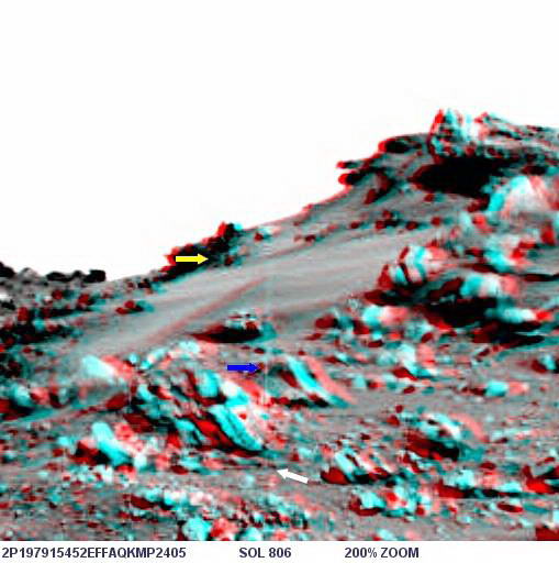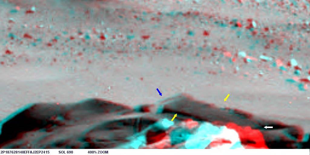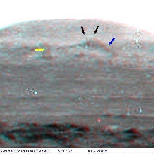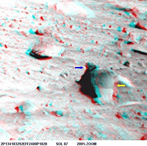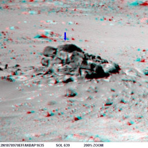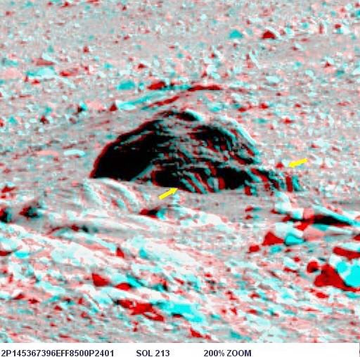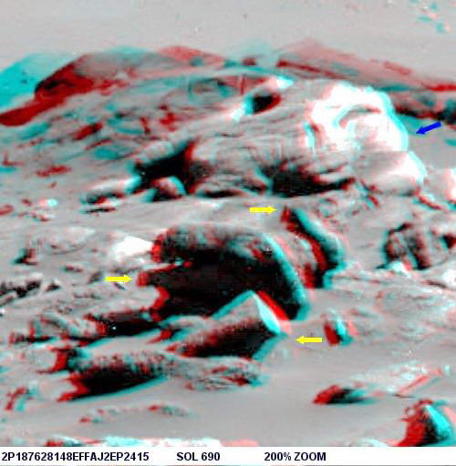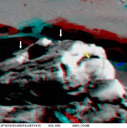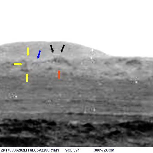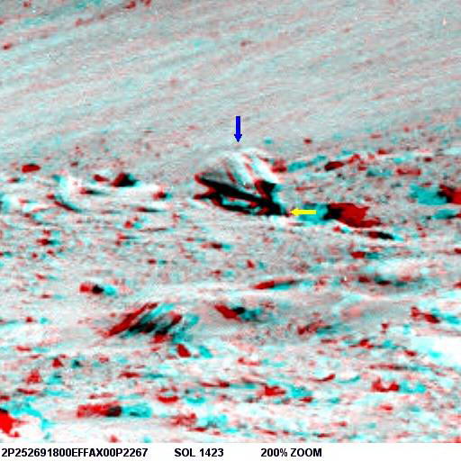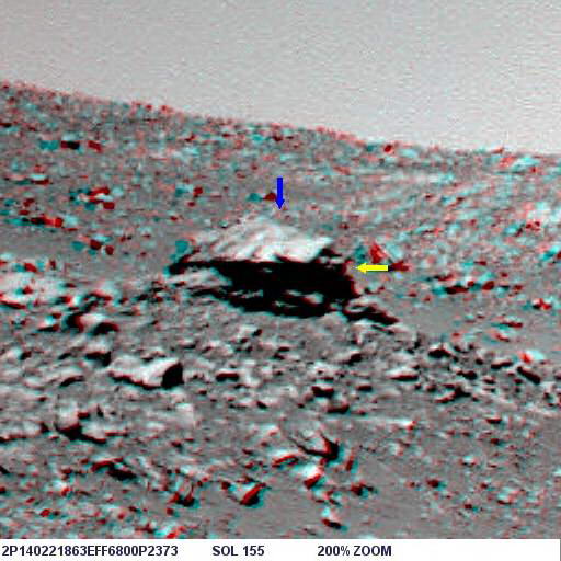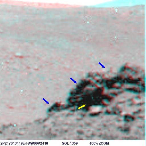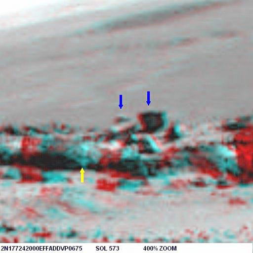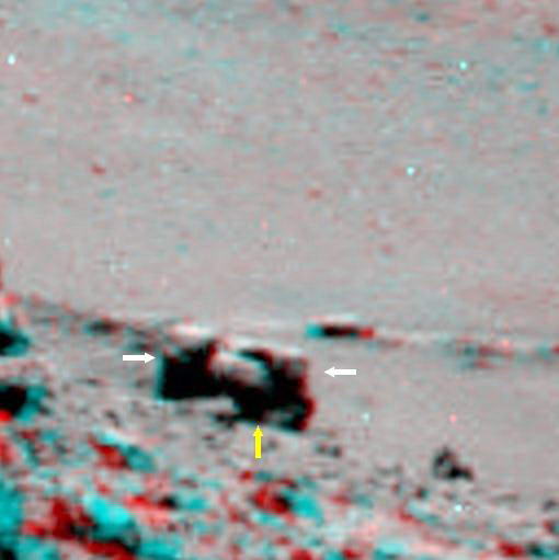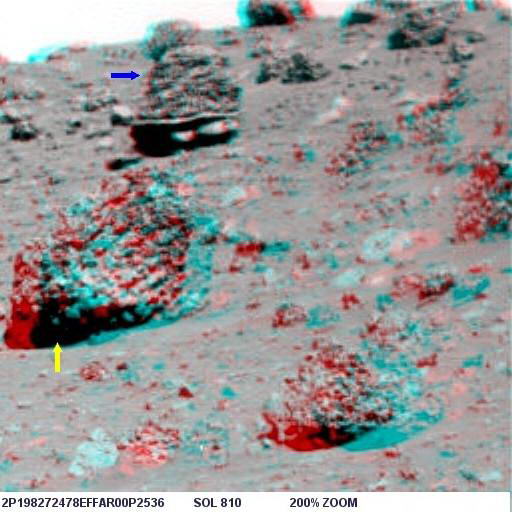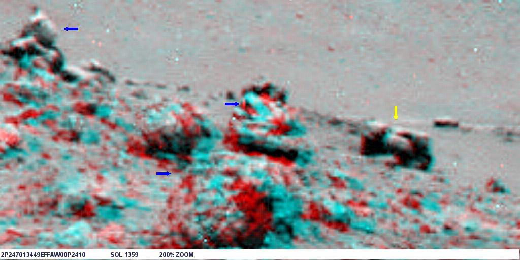 A kék nyíllal jelölt részek ekkor már sokkal inkább valamiféle műszaki berendezés darabjait mutatják. Pl. a legalsó egy dobozféle egységre mutat, a "hatágú csillag" nem is az, hanem a tőle jobbra levő szögletes részletekkel rendelkező formákhoz kötődő, szintén szögletes darab, és a fölöttük levő "szikla" teste valójában több egyenes vonallal határolt, szögletes részletek halmaza. A sárga nyilakat követve szintén hasonló részleteket figyelhetünk meg. A hosszas szemlélődés után az a benyomásom alakult ki, hogy egyáltalán nem kőzetet látunk a képen, hanem sokkal valószínűbb, hogy egy törmelékkel, porral befedett roncsot. Valamilyen berendezés roncsáról lehet szó, amely vagy a talajba fúrodott, vagy utólagosan szóródott rá egy csomó törmelék.