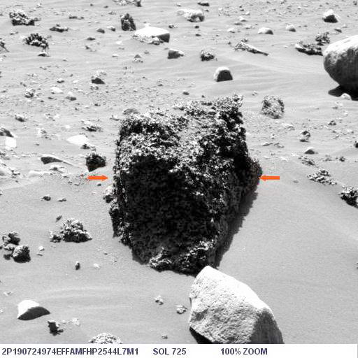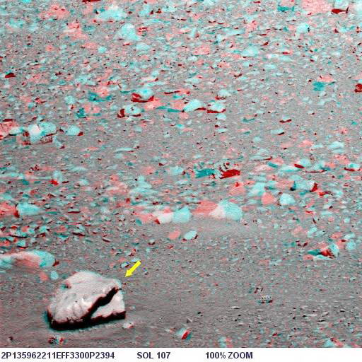 A kép színe itt is borzasztó, "NASA narancs", a kommentár címe: "Spirit beholds bumpy boulder", azaz kb. "A Spirit megpillant egy rücskös szikladarabot" (a fehér nyilakkal jelölt alakzatról van szó). A hozzáfűzött szöveg viszont a következőket mondja: