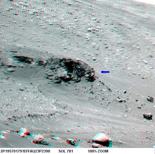 A másik dolog egy másik baki: ennek a felvételnek a "testvére", azaz a pásztázó fényképezésben a megelőző pozíciójú kép, tartalmazza ennek a homokvonulatnak a folytatását, de annak a képnek a jobbszélén levő homokgerinc nem folytatható ezzel a képpel, hanem észrevehető szögben megtörik, holott a két kép széle (ennek a balszéle és a megelőző jobbszéle) átlapolásban vannak egymással! Az átlapoláskor látható, homokgerincen túli alakzatok ugyanazon szög alatt láthatók a két képen, csak a homokgerinc törik meg. Szóval, alapos a gyanú, hogy lenne még valami a képen, de azt nem hozták nyilvánosságra. Könnyen lehet, hogy az eltakart látvány egyértelműbbé tenne katasztrófára utaló jeleket.