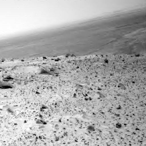 Egyébként ha képprocesszáló programmal elkezdjük nagyítani ezeket a képeket, kiderül, hogy a síkság képe egészen más mintázatot eredményez egy bizonyos nagyításon túl, ami szintén az utólagos elmosásra utal. Ezen a navcam felvételen például a síkságot ábrázoló terület ún. "vizesüveg" mintázatot mutat. Jogos tehát a címben a "rejtély" szó: a NASA feltehetően valamit el akart takarni a kép avatatlan szemlélője elől. Mégis találtam néhány olyan felvételt, ahol "aludt a cenzor", talán ez a válasz a "rejtélyre".