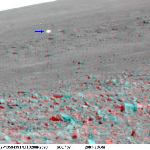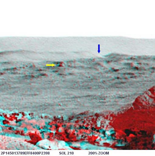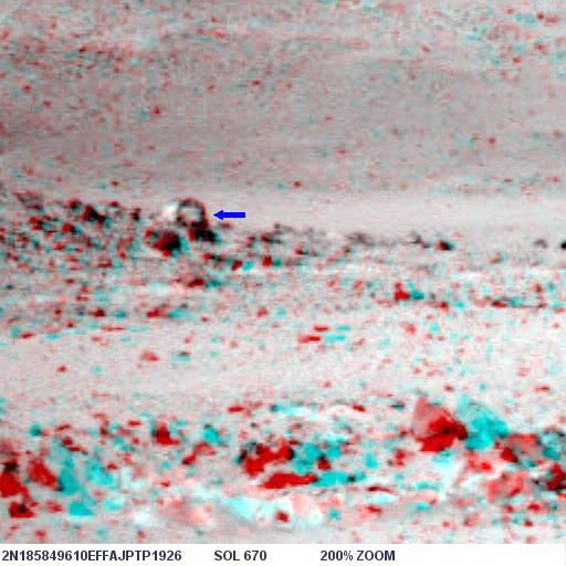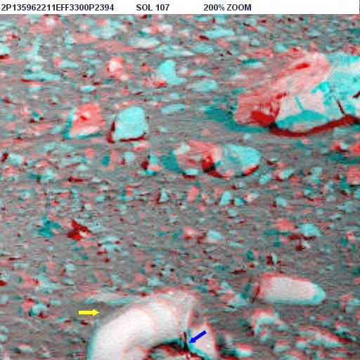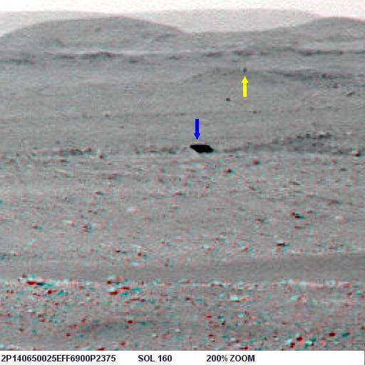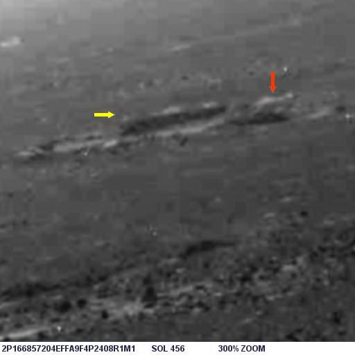 A sárga nyíl valamilyen hosszúkás, a síkság felszínéből kiemelkedő alakzatra mutat, a piros nyíl pedig egy nagyon is határozott alakot mutató nagyméretű tárgyra. Egy olyan tárgyat láthatunk, amely egy központi gömbből és körülötte több (a képen 3 vagy 4 db látszik, de feltehetőleg még takarásban is van) kisebb gömbszerű alakzatból áll. Jól észlelhető, hogy a tárgy jobboldala a felszín fölé emelkedik, a baloldala pedig érintkezik vele. A tárgy vetett árnyéka is látható a felszínen. A központi gömb átmérője kb. 20 pixel, a kis gömböké kb. 10 pixel, az egész formációé pedig kb. 45 pixel, tehát a tényleges méretük 5.4 m/km, 2.7 m/km illetve 12 m/km. Ez az alakzat is kívül esik a pancammal lehetséges távolságmérési tartományon. A távolsága a Spirittől szerintem 2 km körül lehet, figyelembe véve azt, hogy a Spirit a Bonneville krátertől ebben a pozícióban kb. 2.5 km-re áll.