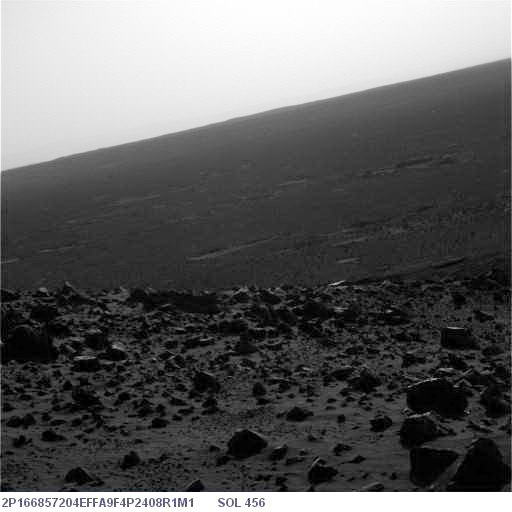 Ezt a hangzatos, kissé bulvár ízű címet azért adtam e szakasznak, mert mint az első rész bevezetőjében írtam, a Columbia Hills-től nyugatra elterülő többé-kevésbé sík területről a Spirit képgalériájában nem nagyon találunk éles, részleteket is tartalmazó képet. Holott, ha a kamerák specifikációját megnézzük, a navigációs kamera mélységélessége a 0.5 m-től végtelenig tart, a panoráma kameráé pedig 1.5 m-től a végtelenig. Ez a kicsiny optikai nyílással függ össze, és azt jelenti, hogy a képeken a kamerától ezen távolságtartományon belüli tárgyakról készült kép az emberi szem számára éles, azaz a legkisebb értékes képrészlet látószöge sem haladja meg normális szemlélési távolságból az 1 ívpercet. Ez például a gyakorlatban azt kellene, hogy eredményezze, hogy a pancam képein olyan tárgyat élesen kell látnunk, amelynek távolsága a kamerától 100 m, és legkisebb jellemző részlete 55 mm! (navcam képeken pedig ugyanez az érték 160 mm) A képeket szemlélve azonban látnunk kell, hogy egyáltalán nincs így. Azokon a képeken, amelyek a "síkságot" tartalmazzák, nagyon jellemzően megfigyelhető, hogy a képeken a közelebbi részletek élesek, de a síkság képe és minden részlete elmosódott, még a homokdűnék és a a kráterek is, amelyek azért mégiscsak hatalmasak az előbbi méretkövetelményhez képest. Ez a kamera bemozdulásától nem lehet, mert az éppen ellenkező elmosódást eredményezne: a közelebbi tárgyak lennének elmosódva és a távolabbiak élesebbek maradnának. A kamerák specifikációja szerint és az előbbi gondolatmenet alapján a síkság felületét meglehető részletességgel kellene látnunk a felvételeken, így teljesen megalapozott lehet az a megállapítás, hogy a felvételek manipuláción estek át, és a síkságot tartalmazó részleteket szándékosan elmosták. Nem lehet cáfolni e feltételezést azzal sem, hogy a síkság felett porfelhő kavarog, vagy pára gomolyog, mert ez lehet, hogy egyszer-egyszer igaz, de évekig nem lehetséges! Ez az elmosás egyébként néha már a nevetségességig aggályosan van végrehajtva, például az alábbi navcam felvételen láthatóan.