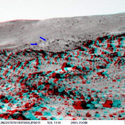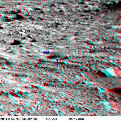 Én ezt csak egyszerűen "bunkerbejárat"-nak neveztem el a kék nyíllal jelölt alakzatot, bár valószínűleg nem az. Mesterséges építmény: a felénk eső oldala trapéz keresztmetszetű, kb. 5 m alaphosszal és kb. 1.5 m felső hosszal, a magassága pedig kb. 2 m. A jobb oldala sötét, de nem árnyékban van, hiszen a Nap felülről süt, hanem azért sötét, mert üreges. Figyelmesen szemlélve látható is, hogy a távolabbi oldalfal felszínnel érintkező részét megvilágítja a Nap. Ez a műtárgy kb. 5-6 m széles lehet, figyelembevéve a becsülhető rövidülést. A közölt méretadatok akkor heytállóak, ha az építmény a kamerától 1 km távolságra van. (Ez nagyjából meg is felelhet a valóságnak a képek eltolódása alapján). Hogy ez az építmény mi lehet, nem tudom megállapítani. Lehet valóban a felszín alá vezető bejárat, épületmaradvány, valami útvonal lezárása stb. Felhívnám a figyelmet a sárga nyíllal megjelölt terepalakzatra: az erősen kiugrik a felszínből, semmiképpen nem egy természetes kődarab, sokkal inkább oszlop vagy kisebb toronyszerű valami. Meglehetősen távol van a kamerától (legalább 2-3 km-re), így jelentősen a felszín fölé kell emelkednie, hogy ennyire látszódjék. Erre a képre nem fért rá, de van a kép balszélén látható (jó messze lévő) domb balszélén is egy hasonló oszlopszerű kiugrás.