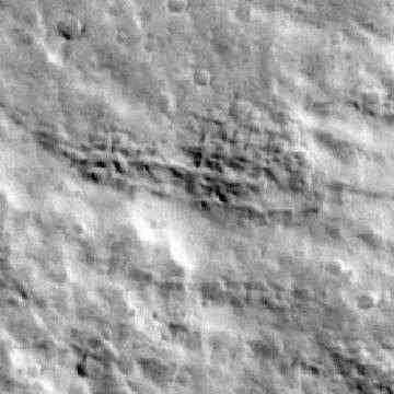 stadion? Még a marsi intelligens élet nyomait elszántan kutatók sem tudnak egyértelműen alátámasztható magyarázatot adni az egyik MGS képen látható horgonyszerű formációra (6. ábra.). A kép még a NASA kutatóit is meglephette, hiszen elfelejtették lerontani a minőségét. Az mindenesetre eléggé nyilvánvaló, hogy ilyen szabályos, és a környezetétől ennyire különböző alakzatot nem a szél ereje vájta ki a marsi homokból…